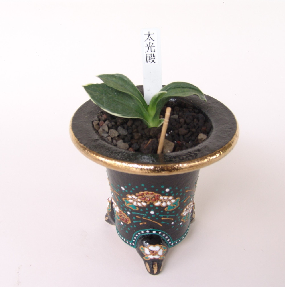 太光殿(たいこうでん) 4年生 鉢 3.8号 地色は緑にやや黄色みがかり、艶消しで柔らかい地合いで左右対称の葉姿は姿勢の良いほうである。3~4才位から本芸を現し、雅糸竜、剣葉を出す。幅のある葉は、まれに葉先が丸止めになることがある。覆輪の色はやや黄色みを含んでいる。時に亀甲型の葉が出る。育ちあがった姿は力強く、見ているだけでも楽しい。性質は強健。採光・施肥はともに普通。増殖は子上げと芋吹きによる。
