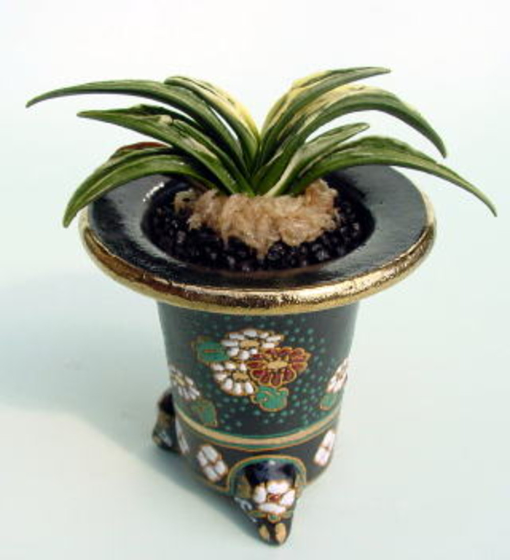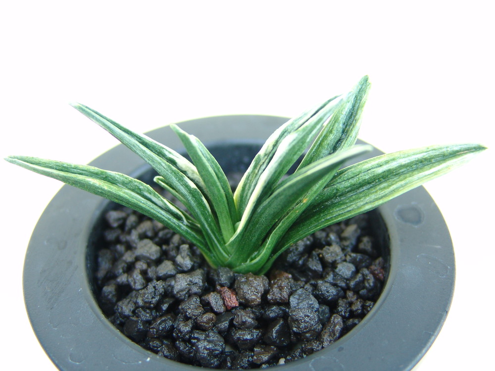 柚の地肌を思わせる粗い地合いと濃紺緑色の葉色が本種の特徴。地肌の有名な『聖雲殿』と似ている。葉長は7㎝、葉幅は2㎝内外と小型種。葉繰りは普通で左右の均衡が良く、姿は乱れない。葉芸は若木の頃は熨斗葉、成長に従って総雅糸竜を現す。覆輪は浅い。少し柔らかく腰太に作ると見事な芸を現す。芋はやや弱く繁殖良い。肥料は控えめ。