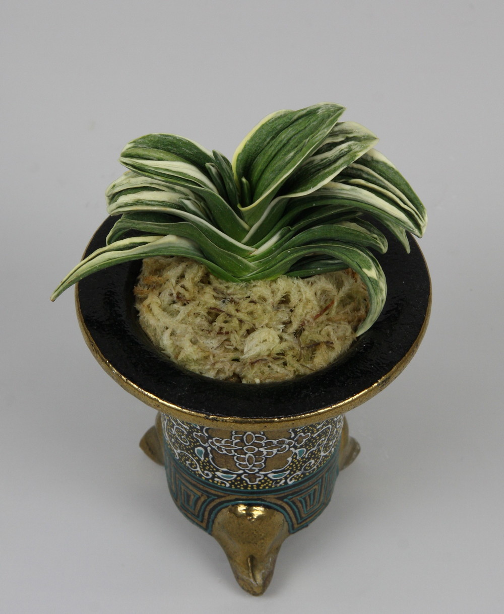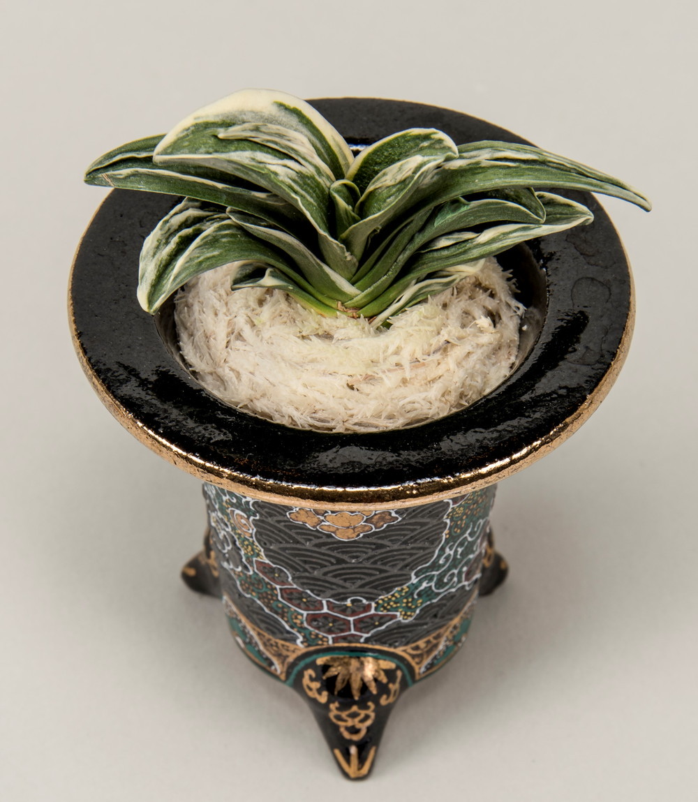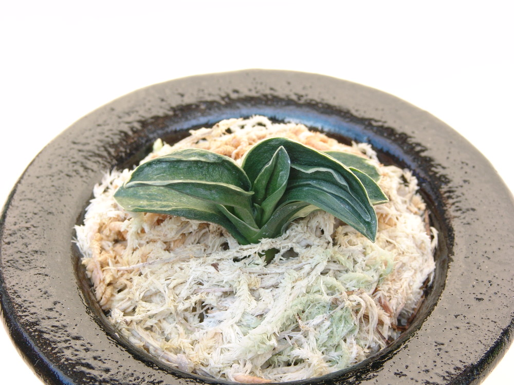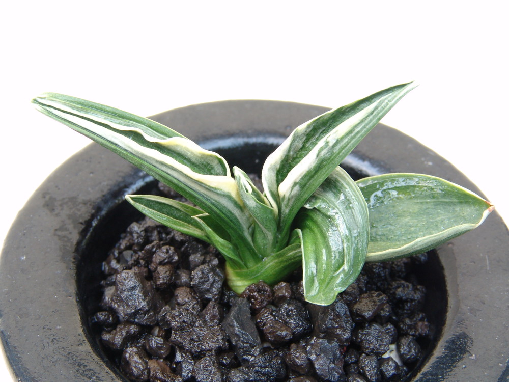 中型種。実生の収集家として有名であった小田井律樹氏が培養し始めての子を登録者に棚割りした。その後順調に殖えて命名した。全体の葉姿と若きの頃の愛嬌あるところが、その名の由来である。艶消し地の粗れ地で、白い覆輪がその輪郭を鮮明にする。熨斗葉、雅糸竜、鈴虫剣、剣葉などを現す。性質は強健、繁殖は芋吹きによって殖やす。