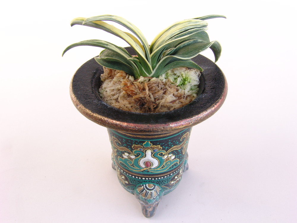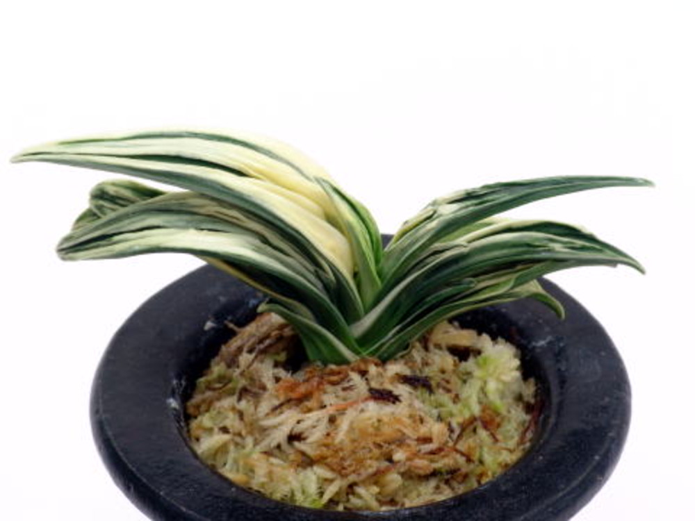 東三宝(あづまさんぽう) 4年生 鉢 3.8号 中型種。独特の光沢ある葉は紺性が特に強く、葉肉があり、葉先が鋭く尖り葉に力がある。葉幅も広く首元の太い力量感のある、気品の高い品種である。盛り上がる雅糸竜を葉面一杯に現し、剣葉、鈴虫剣をあらわしても葉姿は崩れることはない。葉姿は中型種の中でも均整がとれ、片繰りすることはない。整然とした雅糸竜は独特であり、人気の長さもうなずける。性質は普通だが、子上げ・芋吹きともに良く、採光は強めで、施肥は普通である。