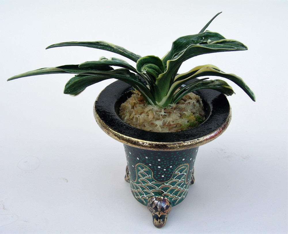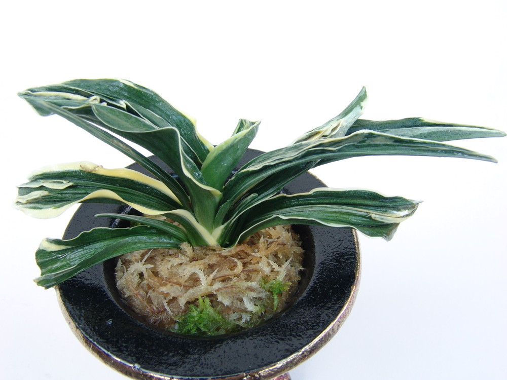 白麟(はくりん) 4年生 鉢 3.8号 葉長13㎝、葉幅5㎝内外。白い粉を吹いたような濃紺緑色の地に白覆輪で覆う。滑らかな感じの地合い。幅広でありながら葉先は急に尖る。高い甲竜、熨斗葉、本剣、鈴虫剣を現す多芸品。剣葉は多く出るが、片繰りになることがない、採光は強め、施肥を弱めにする。性質は少し弱い品種。