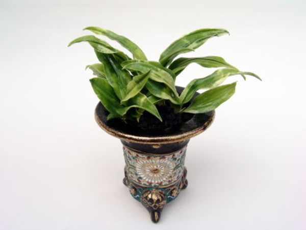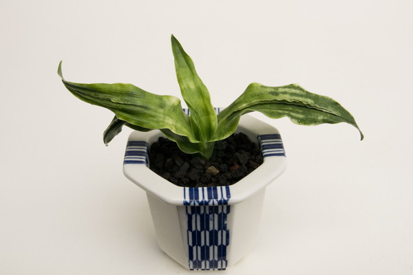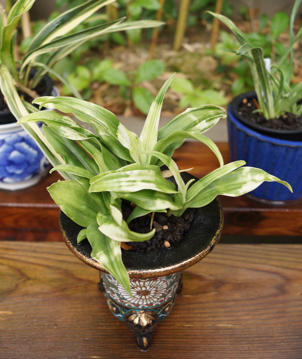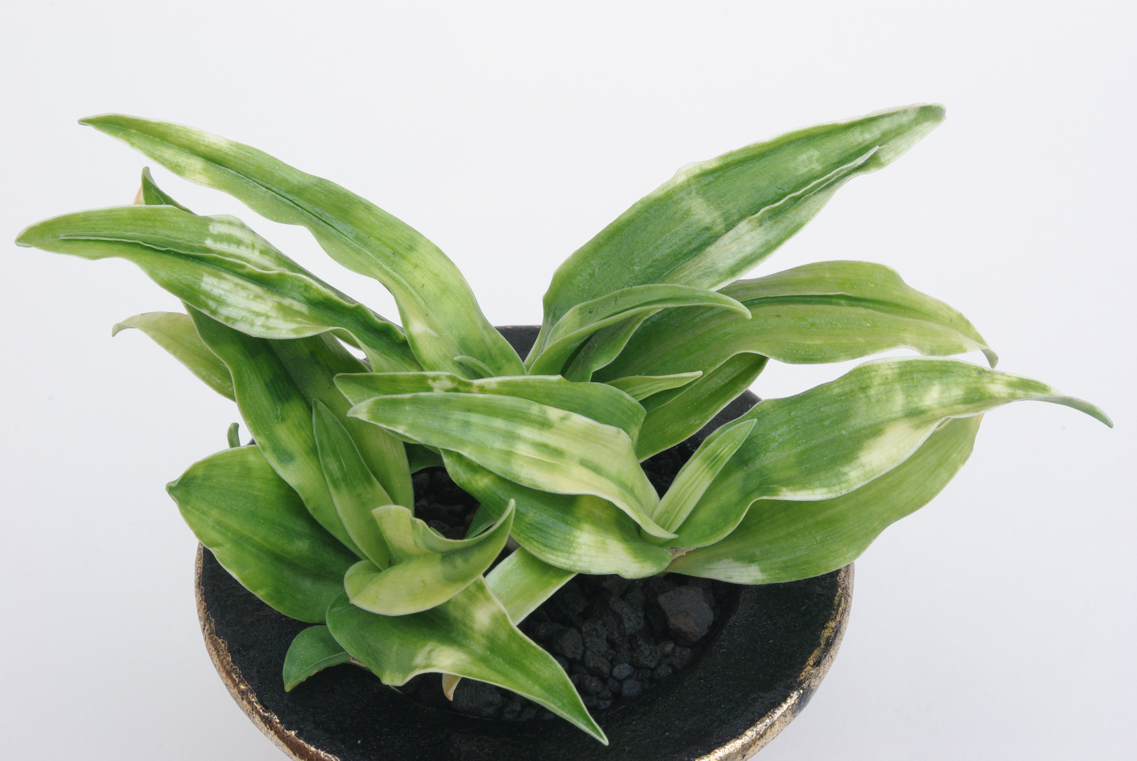 非常に古い品種。今お持ちの方は皆から尊敬される相当なマニアです。中型で、鉢は3.5号から大きく株にしても4号ほど。10.5センチから12センチの直径の鉢に収まります。日本全体の温暖化や日差しの強さで、この矢筈系統や曙系統は柄が出やすく、楽しみやすくなっています。気温が上がるほど、また、日に当てれば充てるほど、これらの系統は柄がでます。葉の薄めのものは多少気にしますが、この白蝶は葉肉が非常に厚く、新芽の動き出すときから伸びきるまで、しっかりと日で“あぶって”あげましょう。あぶり出しのように柄がでてきます。その時に、朝日が当たる場所に置ければベストです。どのおもとも朝日が好きなので、朝日が一番よくあたる場所がそのお棚の持ち主の一番好きなおもと、とも言われます。