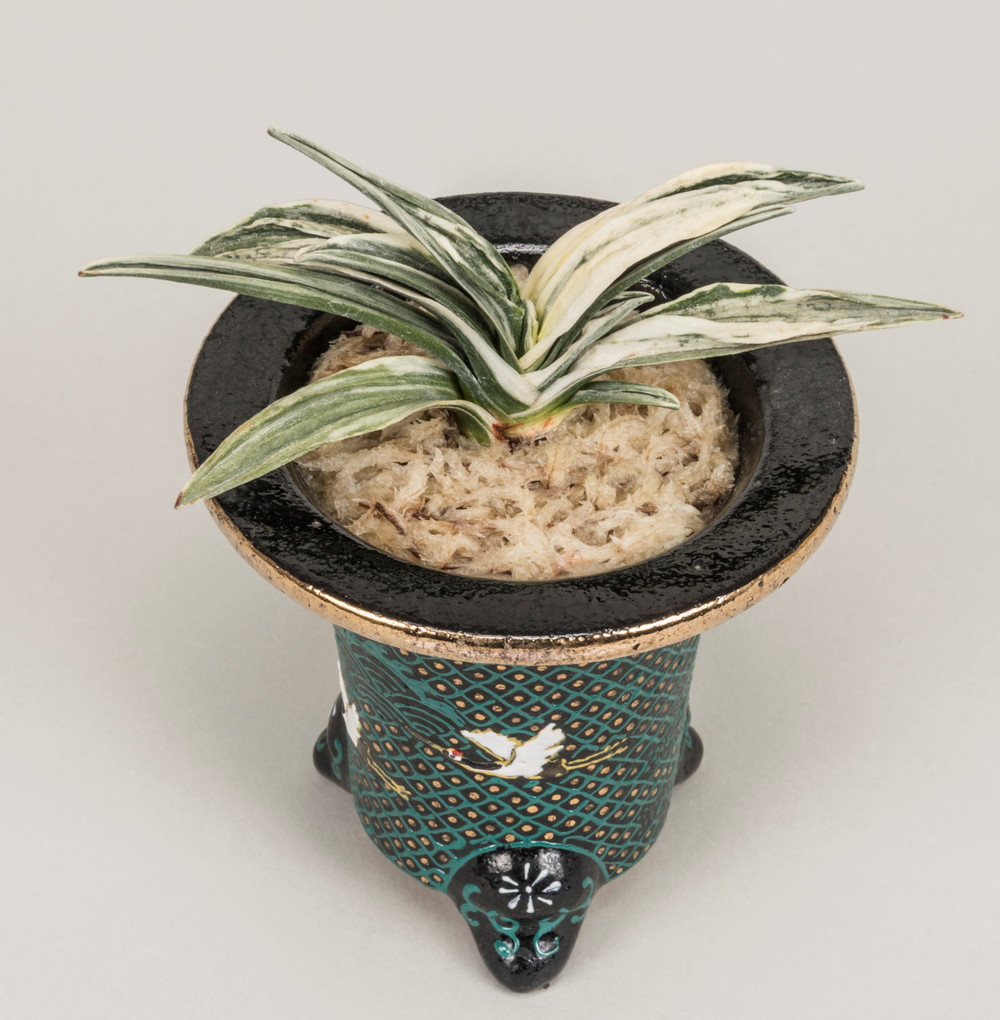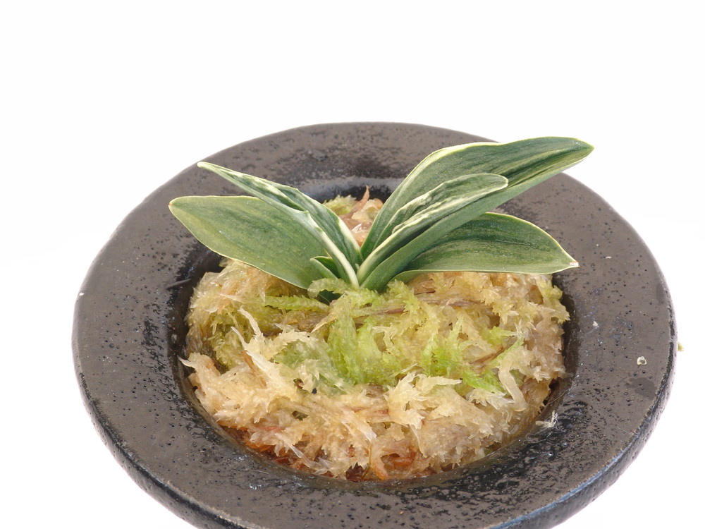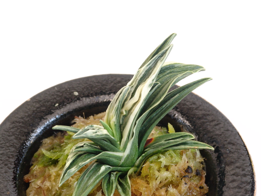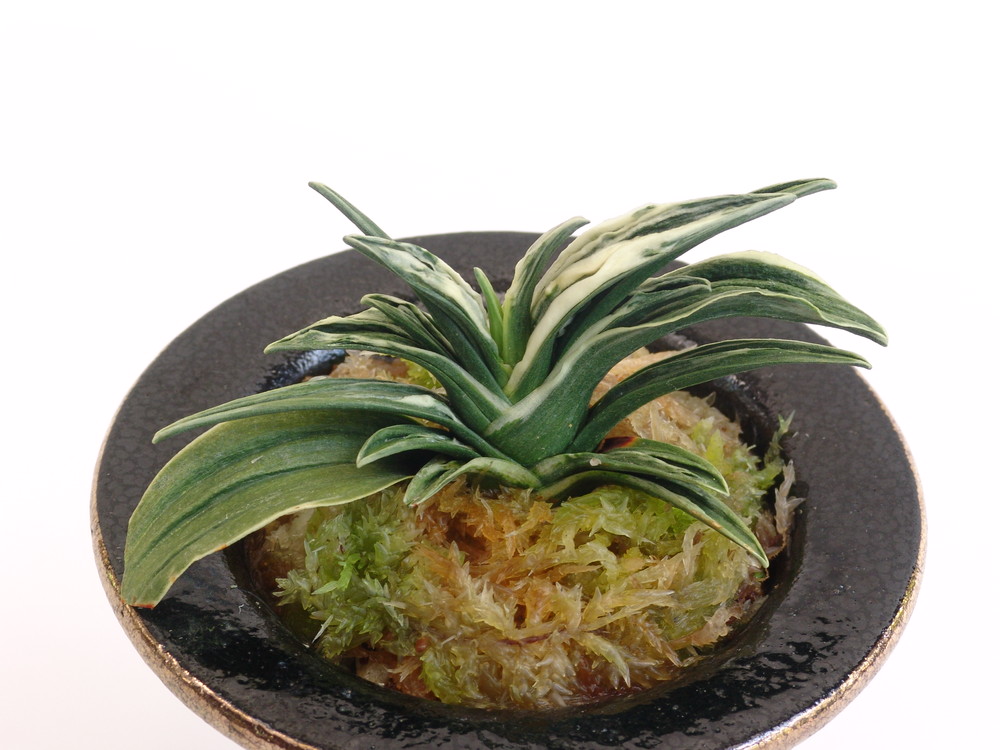 宝玉(ほうぎょく) 4年生 鉢3.5号 小型種。覆輪が完成するまで20年以上もかかつた。しかし未完成の時代から、地合いと芸、葉姿に魅力があり注目されてきた。縞か無地の時代は、艶消しの深みのある地合いを持っていた。そして、その葉姿は扇を広げたように直線が強い、力のある形になる。覆輪が回ってから地色は紺性を増し、艶やかな潤いを持った地合いとなり、覆輪は純白で、首元から伸びる直線が明確に見える。性質は強健。子上げはしにくいので、芋吹きによって繁殖する。