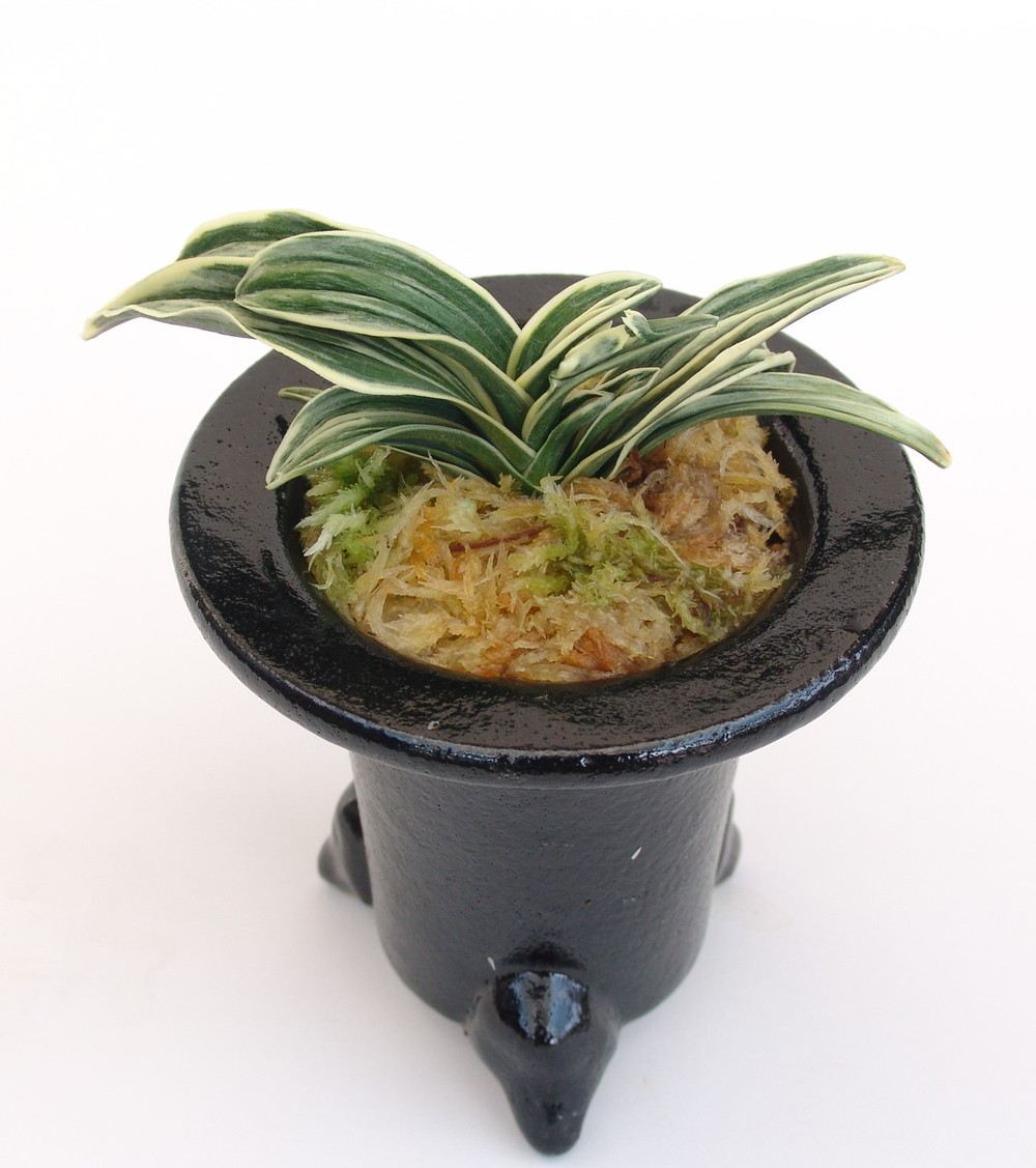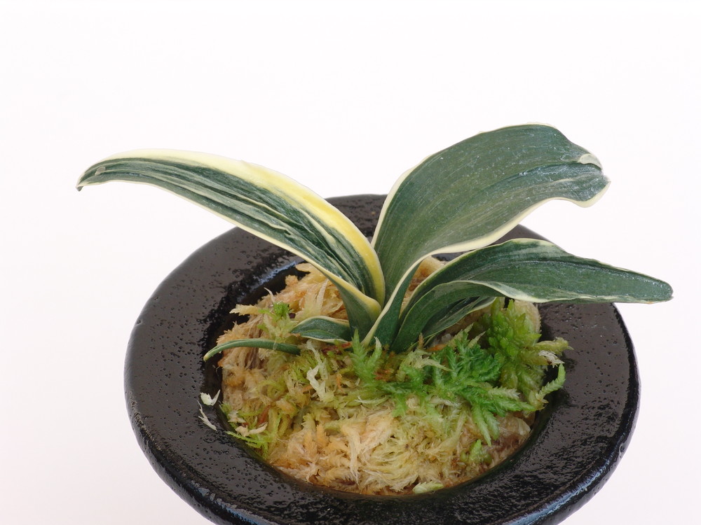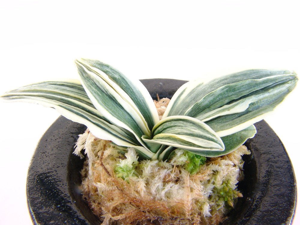 宝山(ほうざん) 6年生 鉢3.5号 羅紗系の中型種。濃緑色の広い葉は太い筋のような二面竜を見せ、剣葉、鈴虫剣、雅糸竜を見せる。純白の覆輪は年を重ねるにしたがい、葉全体を覆い美しさを見せる。巾広く葉先が尖る。性質は強健で作りやすい。繁殖は普通です。芋吹きが多い。
