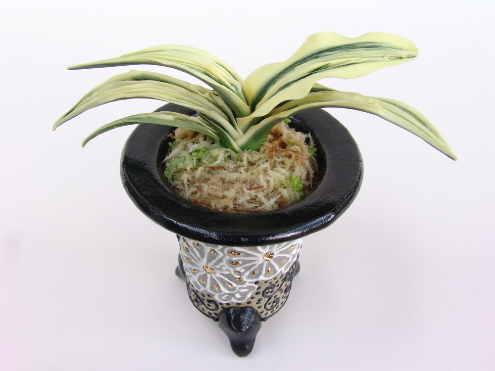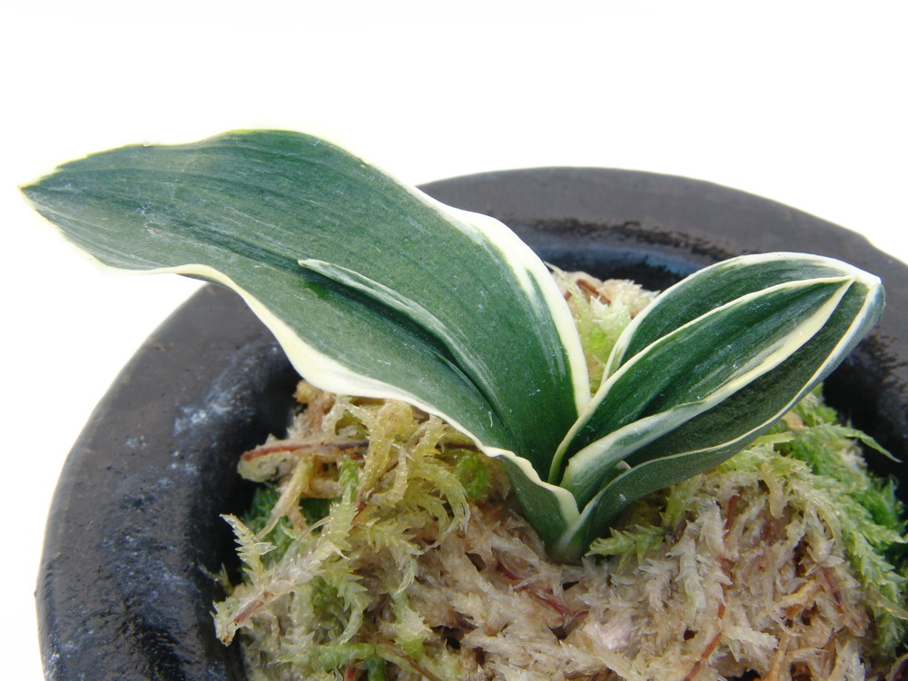 妙峰 (みょうほう) 5年生 鉢3.8号 昭和45年頃、兵庫県池田市在住の趣味者から、京都三光園服部弘氏が十数本程に殖えた実生を買い入れ、当地の地名にちなんで『妙峰』と命名する。立ち葉で、葉元は広く、葉先は鋭く尖り、葉一面に総雅糸竜を現し、少し黄色みを帯びた覆輪は深くかかり黄金色に輝き、綺麗である。性質は強く、葉繰はやや悪いが、容姿端麗である。採光はやや弱いほうが良く施肥は普通が良い。