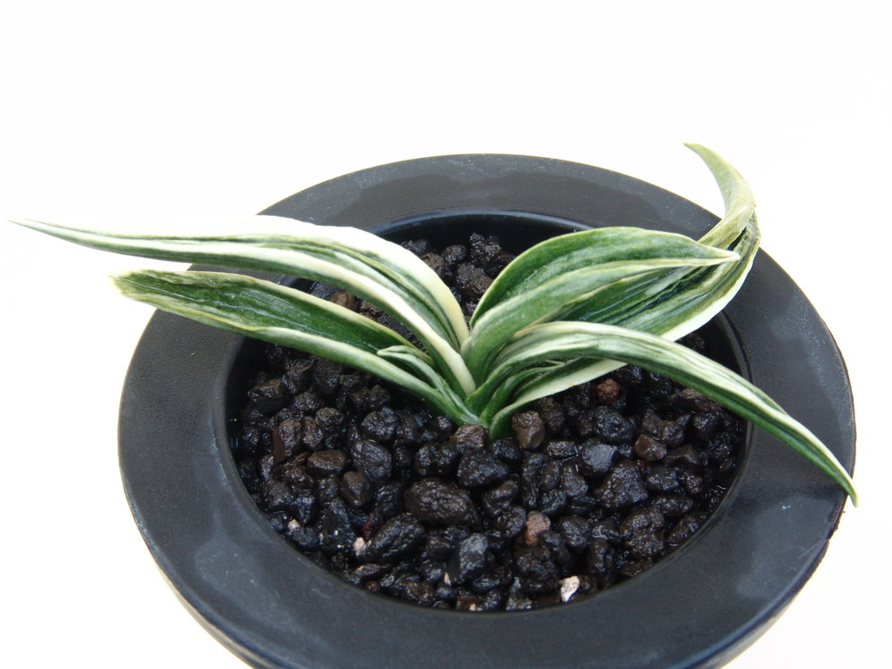 羅紗王(らしゃおう) 4年生 鉢 3.5号 作出者の手によって生まれた実生。その後登録者に渡って長らく『年実生』の名で親しまれてきた。昭和30年頃になって覆輪も完成した。葉長8㎝、葉幅1.5㎝内外の細葉、中型種である。濃紺緑色でやや粗れた地合いは艶消しとなり、細葉ながら重厚な葉肉は葉先に向かって鋭く伸び、腰低く、腰折れの良い独特の容姿が特徴である。整然とした襟組みと総雅糸竜が葉先に向かって流れ、地合いと相まって味わい深い。性質・繁殖普通、やや弱めの採光が良い。