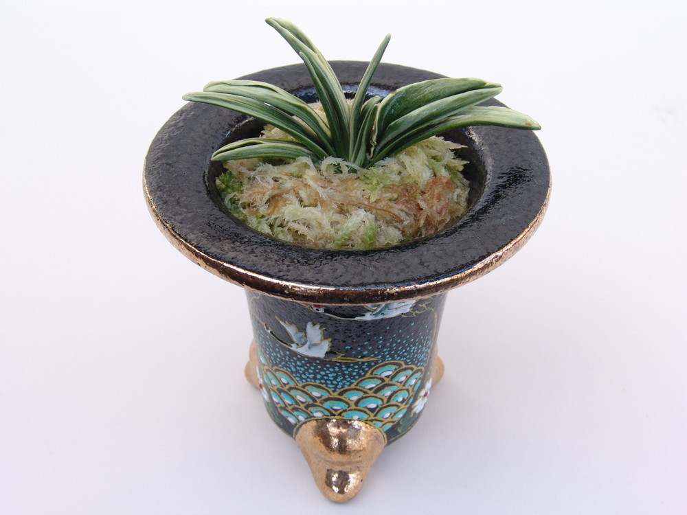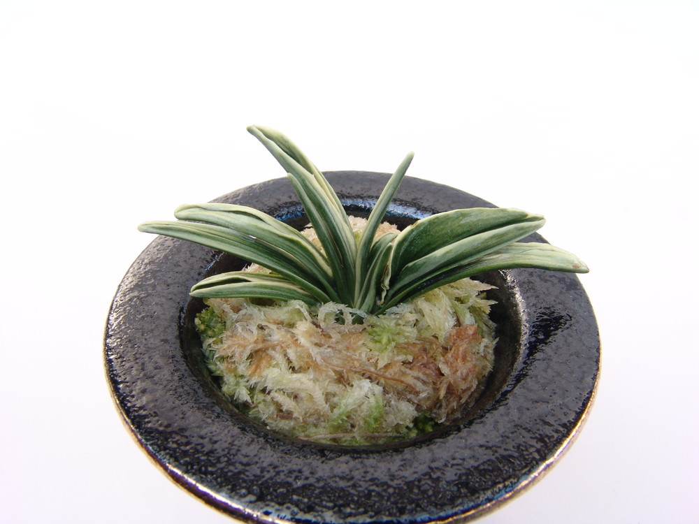 麟晃冠(りんこうかん) 4年生 鉢 3.3号 葉長7㎝、葉幅3㎝内外の中型種。葉肉の厚い葉は淡い緑色で艶のある地合いをしている。白の覆輪が深くかかり、のりをはいたようになる。葉芸は熨斗葉を主体とし、本剣も出し、二面竜が現れる。姿勢の良い品種。性質はやや弱く、繁殖は普通。大正8年頃、静岡県で生えたもの。のち、奈良県の神田樽太郎氏が求め大正14年頃に命名、紹介する。