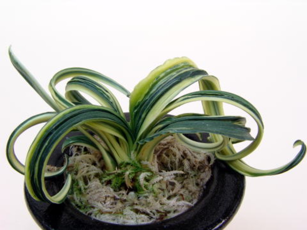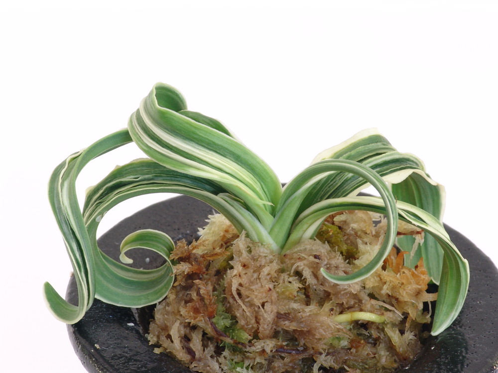 葉長10㎝、葉幅1.5㎝内外であまり広葉ではないが、巻は非常に良く、低い総雅糸竜と玉竜をかける。芋は柔らかく、子上げは非常に良く、繁殖は良い。葉繰の良い品種で特に3年葉は楽に持ち、作は容易です。作出実親に群雀の血が入っている模様でその癖が出ている。採光を強くして、施肥は控えめが良い。
