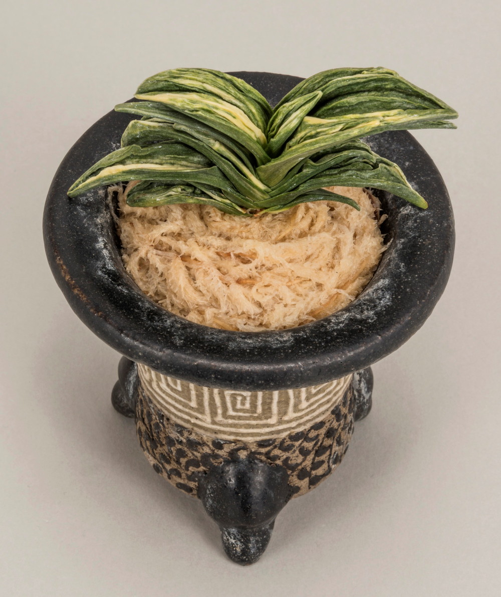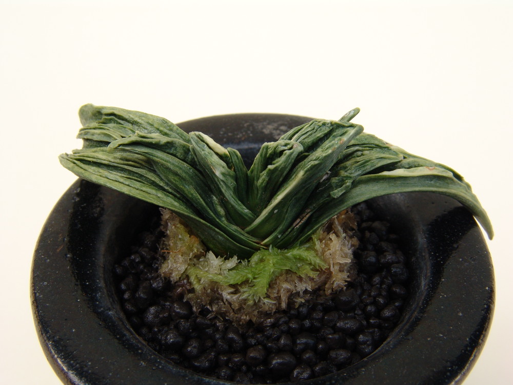おもと 壽冠(じゅかん)熨斗葉、盛り上がる雅糸竜、剣葉を現す小型種。今現在これほど芸に伸びしろのあるおもとはなく、棚入れ希望者が殺到している最高貴品。柔らかい艶消し地の当歳より注目を集めた。豊明園にて修行していた加藤庄市氏作出の貴品。実親『カキガラ錦福』は小型羅紗作出には不可欠になっている。性質は弱め。採光は普通、肥料は少なめ。芋吹きで殖やす。銘鑑の横綱の位置にあり、まだ数が数えるほどしかなく、羅紗の芸の素晴らしさを味わえる。