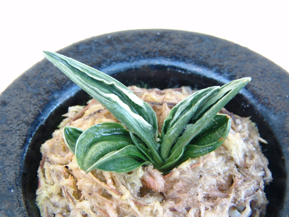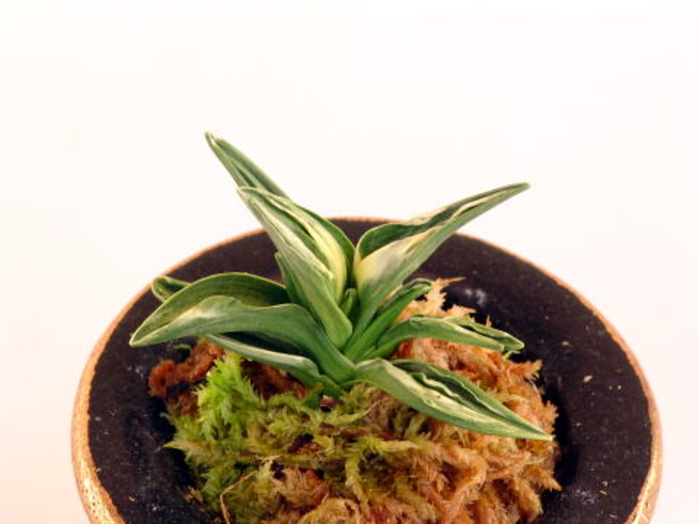 雲山(うんざん) 6年生 3.5号鉢 小型種。葉肉が厚く、濃紺緑色の葉は艶消し地で、葉先は鋭く尖り、盛り上がる雅糸竜、熨斗葉をみせる。葉幅は2㎝ほどにもなる。葉姿は腰折れ良く剣葉も現す重量感に満ちた銘品である。厚い熨斗葉と力強い雅糸竜は、一見してこの品種であることが判別できる。性質は強健で、採光・施肥とも普通。