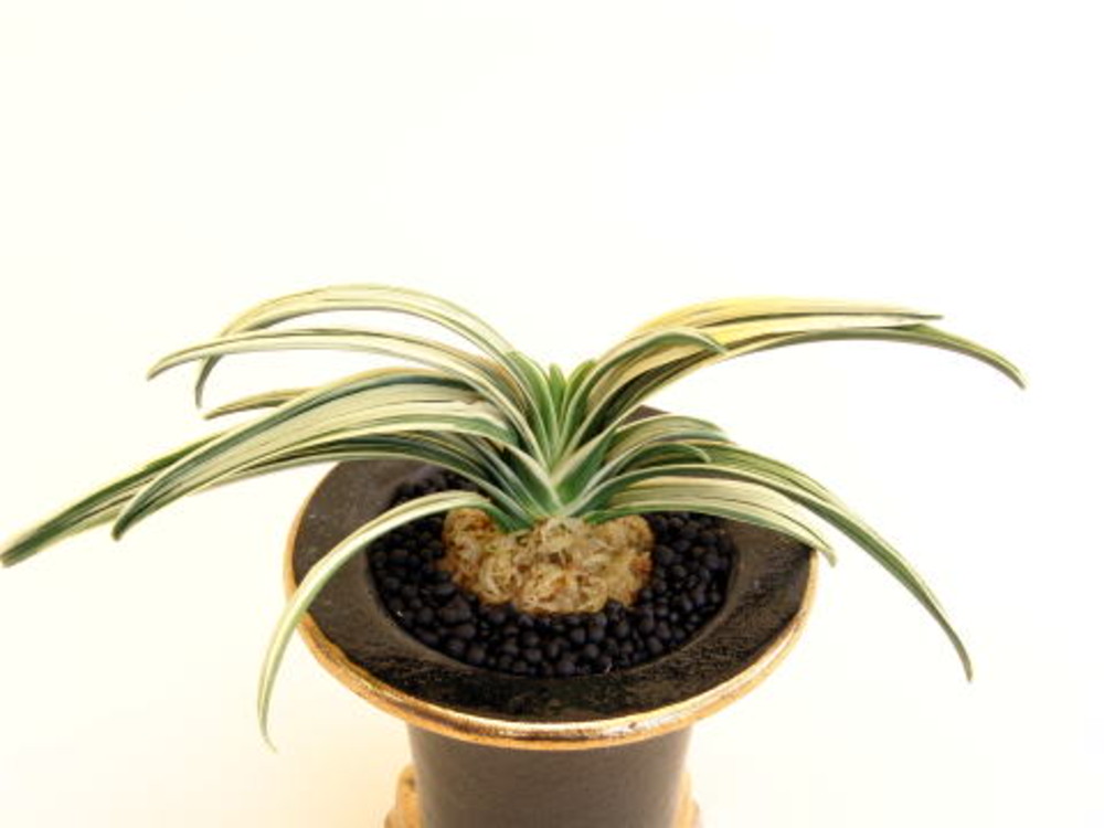 芸州(げいしゅう) 6年生 4号鉢 縞甲系としてはやや小型種。独特の強い紺性の地合いで、きわめて葉繰りが良く、折下げの良いきれいな葉姿である。やや細目の葉幅で葉先が鋭く尖り、白色の覆輪を深く現す。まれに玉竜も現す。その名が示す通り、広島地方で広く愛培されていた。性質は強健で、採光は強めにして、施肥はやや弱めにする。繁殖はきわめて良好で栽培しやすい品種である。