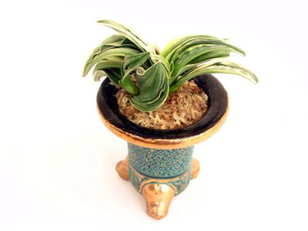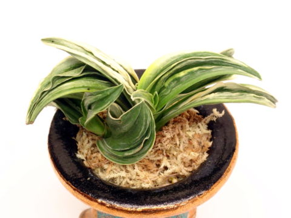 春興殿(しゅんこうでん) 5年生 鉢 3.5号 羅紗地系の中型種。濃紺緑色の地は柚子肌でに白い覆輪が深くかかる。本剣、折り熨斗葉、鈴虫剣、甲竜、雅糸竜を現す丈夫な品種。繁殖も良好。