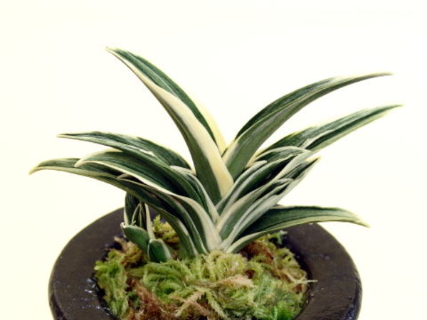 寿星(じゅせい) 5年生 鉢3.8号 作出・命名者が愛知県の三河地方で求めた実生を実親に育てて生まれた物。葉長8㎝、葉幅3㎝内外の中型種。濃緑色の紺性の強い葉で、やや艶のある粗れた地合いに純白の深い覆輪を見せる。葉姿良く、襟組の乱れない中立ち葉で葉先尖る。折り熨斗、繊細な雅糸竜を現す。芸を現すのが少し遅い。丈夫な品種です。採光・施肥は少し強め、繁殖は普通、作り易い品種。