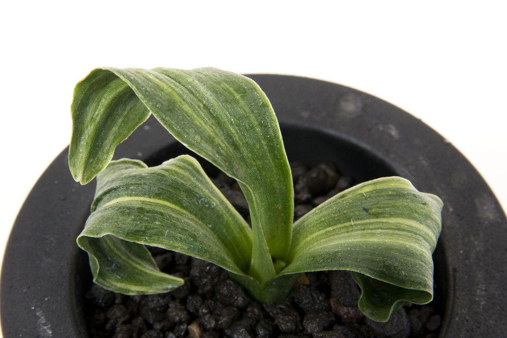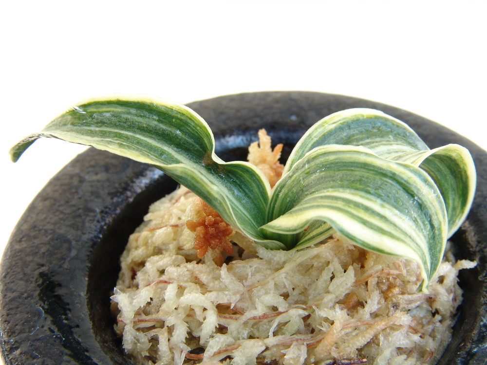 寿円 (じゅえん)1年生 葉長10㎝、葉幅2㎝内外の中型種。羅紗獅子の先駆けとして、万界を騒がせた逸品である。濃紺緑色の地合いの厚めの葉に、甲竜、熨斗葉、本剣、雅糸竜、を現し、白黄色の覆輪は深く輝き、高い雅糸竜が現れる。性質は普通で子上げすることもあるが、芋が柔らかいため採光を十分採って、芋を堅く仕上げるほうが良い。施肥はやや少なめ。