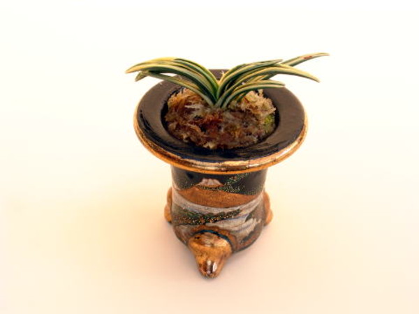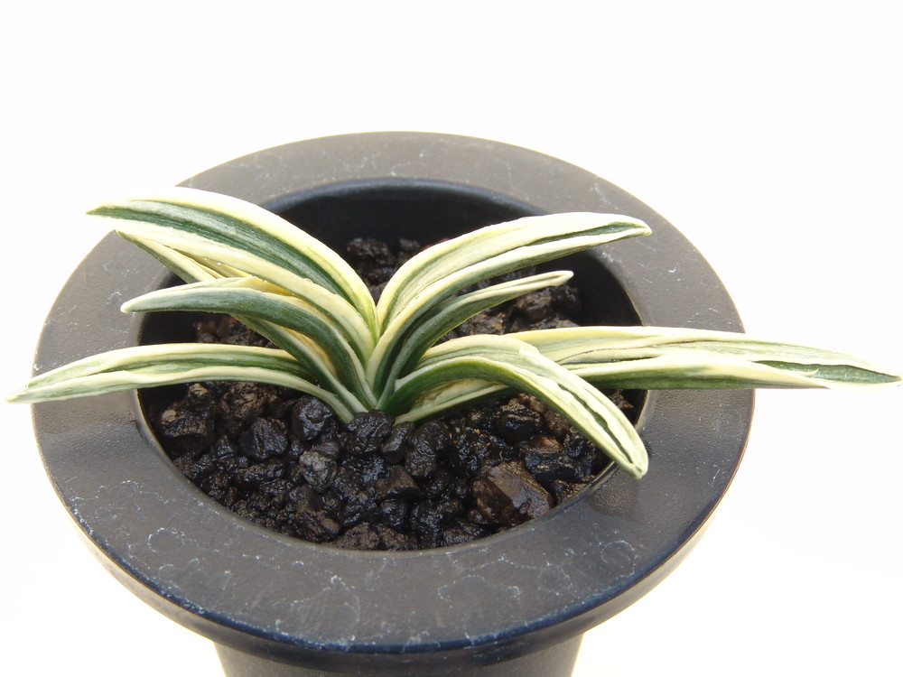 聖寿冠(せいじゅかん)4年生 3.0号鉢 葉長4㎝、葉幅1㎝内外の小型種。3才頃から雅糸竜、本剣、熨斗葉を現すようになると、葉全体がおしろいをはたいたような粘りのある浮き地になり、葉は細く尖り、姿は端正で気品がある。性質は丈夫であるが、芯が止まることもあるが、子上げ良く繁殖は良い。採光は普通で、施肥は中程度が良く、初心者の人には作りやすい品種である。