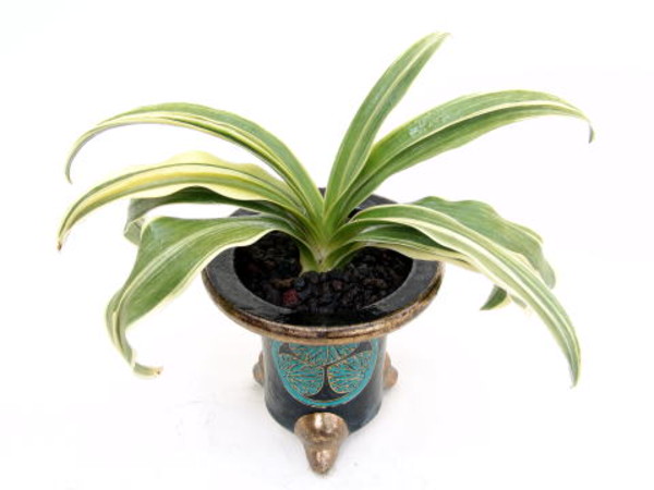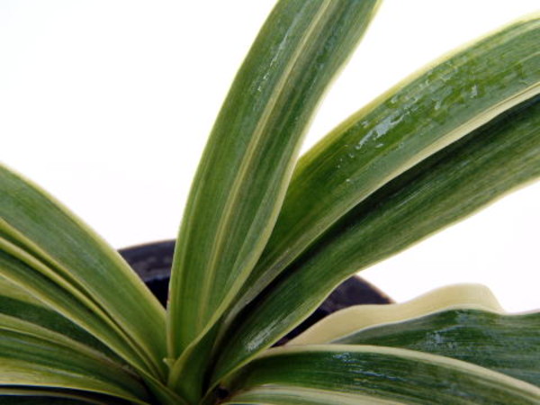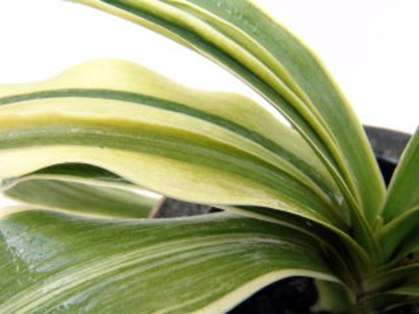 天司鳳(てんしほう) 5年生 鉢 12cm(4号) ゴマ斑系統 葉長15~20cm、葉巾3~5cm内外。黄色味をもった覆輪をかけ、まっすぐな龍が昇る。龍はすべてのるわけではない。葉全体にゴマ斑がのり、斑がきらきらと光る。葉先は少しとがり、ゆったりと垂れる。葉肉はあるが柔らかい葉は優しいイメージを抱かせる