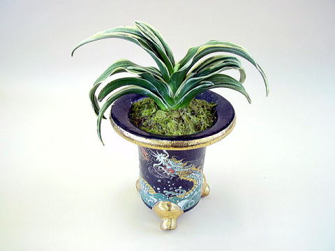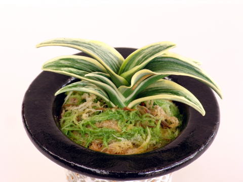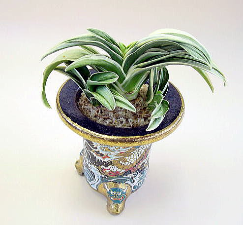 東亜冠(とうあかん) 7年生 鉢 4.0号 濃緑色の葉に艶消し地の柔らかい地合い、覆輪が全体に白くかかる。雅糸竜、二面竜を現す、腰太く葉数も多い魅力ある品種。子上げ良く性質は強健で作り易い。