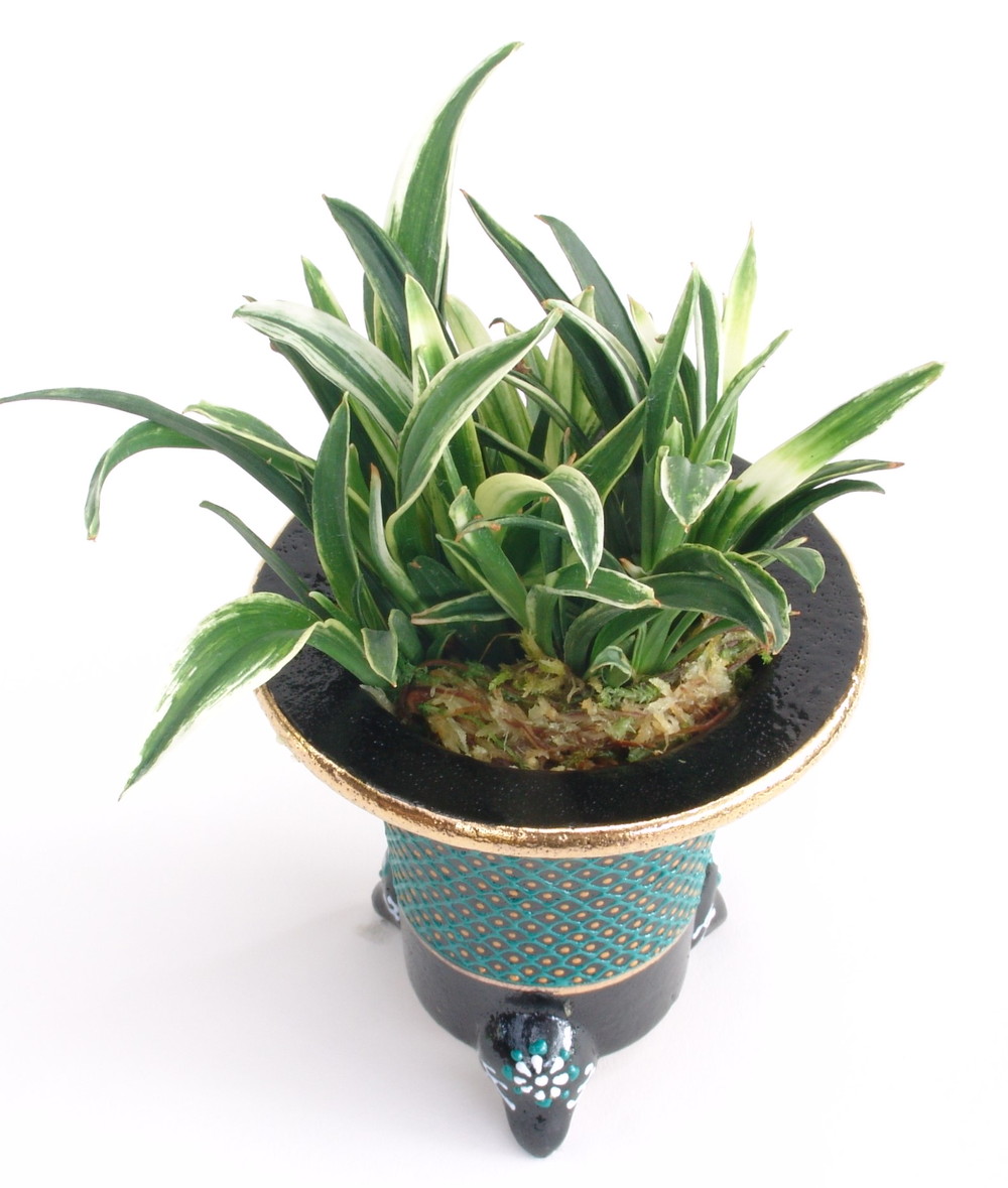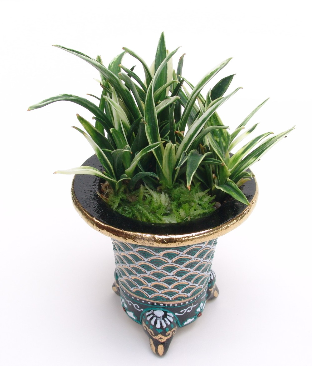 濃緑色の葉に砂子覆輪を現します。性質は中、作り易く株立ちになりやすい。葉の先端に白く雀のくちばし状のように見える葉(雀芸)を見せまる可愛らしいおもと。