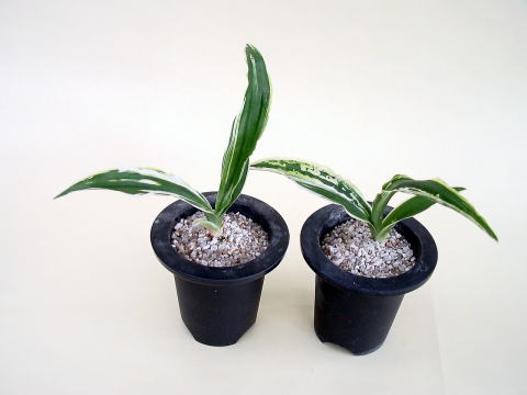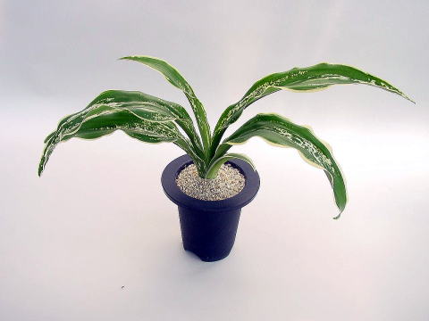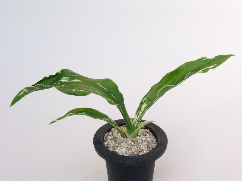 鳳凰山(ほうおうざん) 4年生 鉢 6.0号 『都獅子』に図が現われたもの。濃緑色の葉はゆったりと波を打ち、葉の中ほどから葉先が大きく垂れ下がります。細い長い葉に白い覆輪をみせ、葉に図が現われます。性質は強健で作り易い。