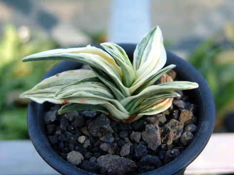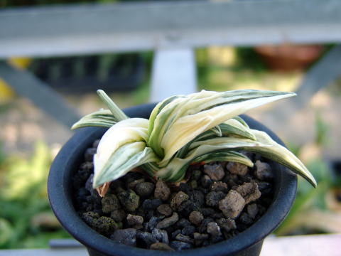 睦山(ぼくざん)7年生 鉢3.2号 愛知県の通称八百鉄氏が三河地方で入手し、 培養していた実生である。生え3歳の時、命名者に納めた。初子が完全覆輪に一度は覆輪の子を手放すが、再度買い戻し、鋭意培養増殖に努め棚割した。葉長8㎝、葉幅3㎝内外の中型種。首太く重厚、純白で美しい総雅糸竜は盛り上がり、華やか、熨斗、剣葉も稀に現わす主に芋吹きで殖やす。
