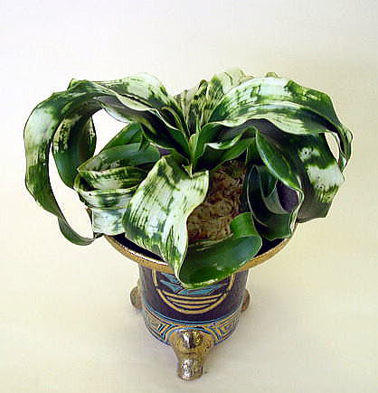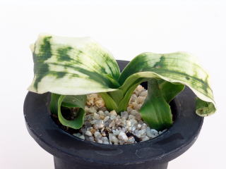 濃緑色の葉に白い柄を見せ大柄に入る矢筈柄葉の裏から見ると矢羽の模様が良く分かります。性質は強健で作りやすい品種。新芽の伸びる時期に日光を充分に採ると柄が出やすい。