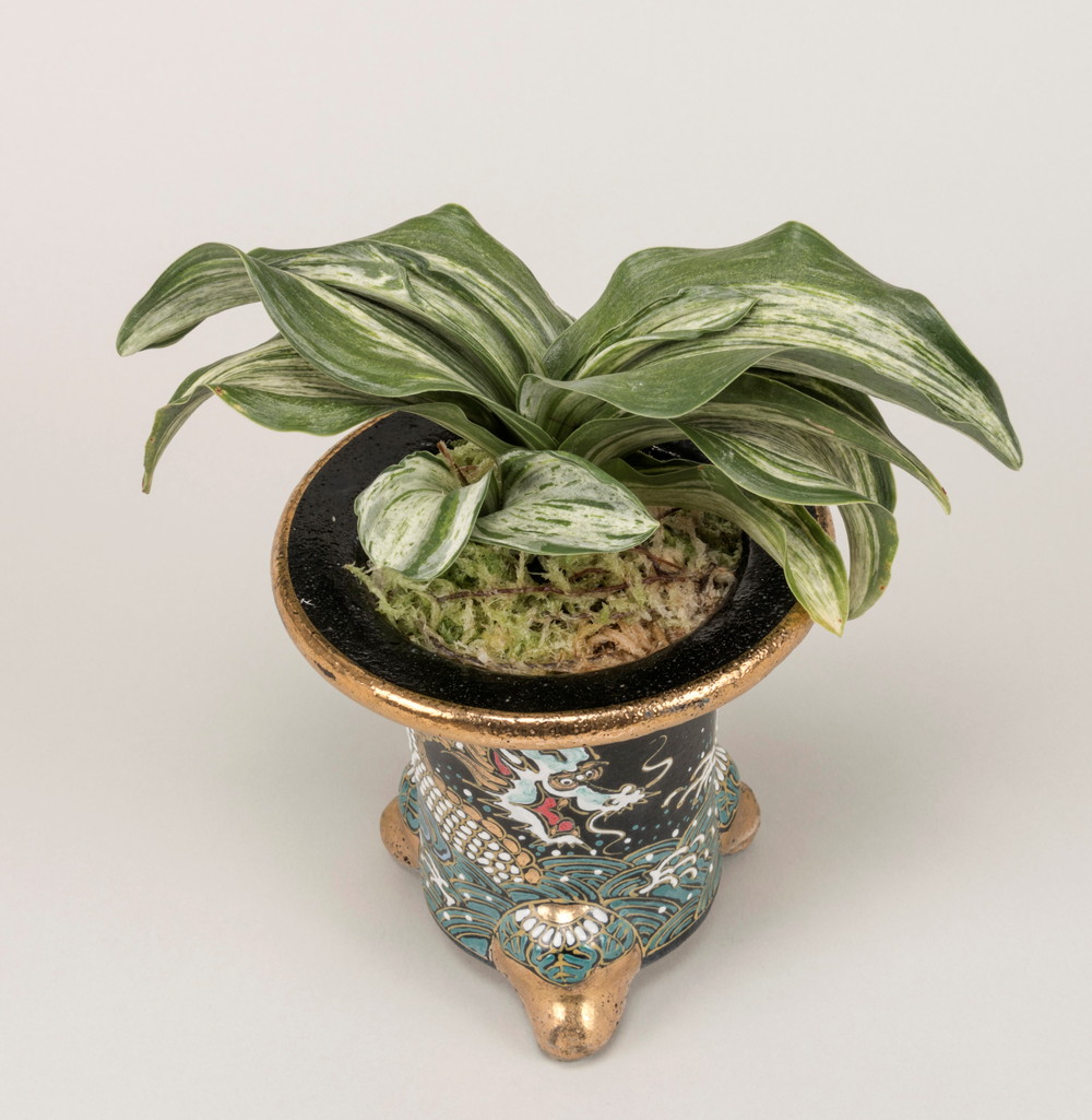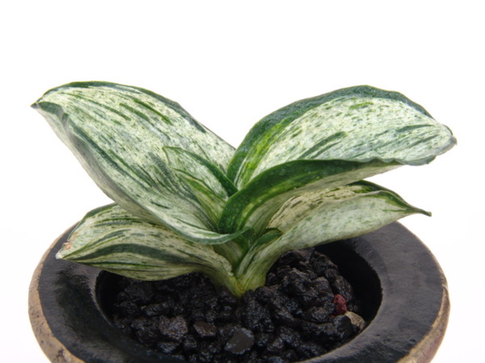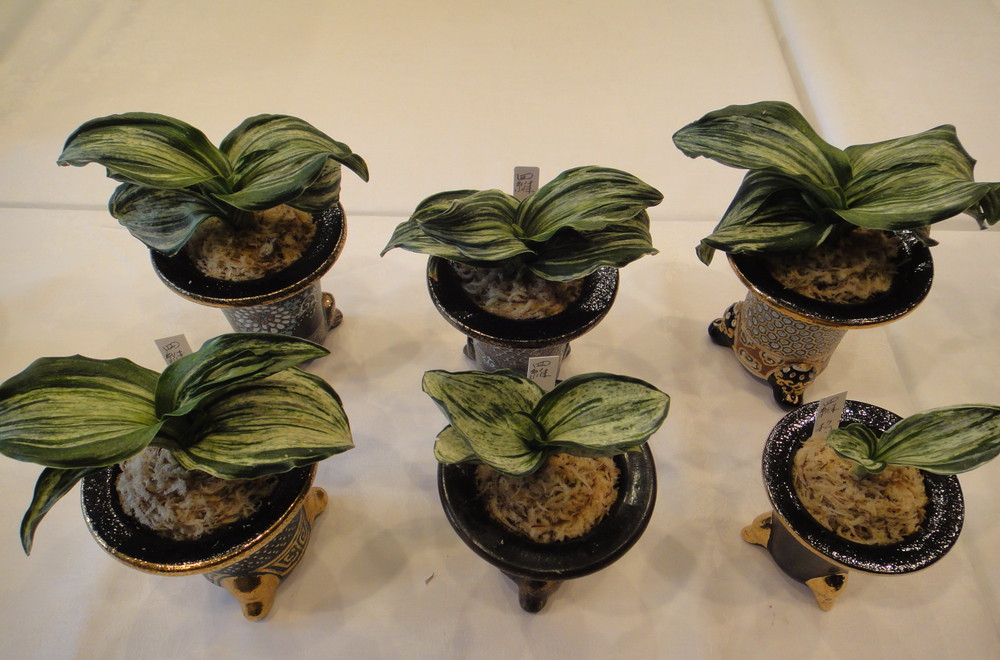 羅松(らしよう)2年生 千代田羅紗系の丸い葉に深い紺覆輪を現し鮮明な千代田斑を現す。丸みのある独特の葉型は特徴があり魅力的。