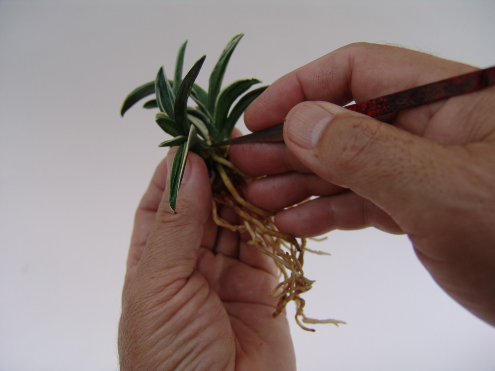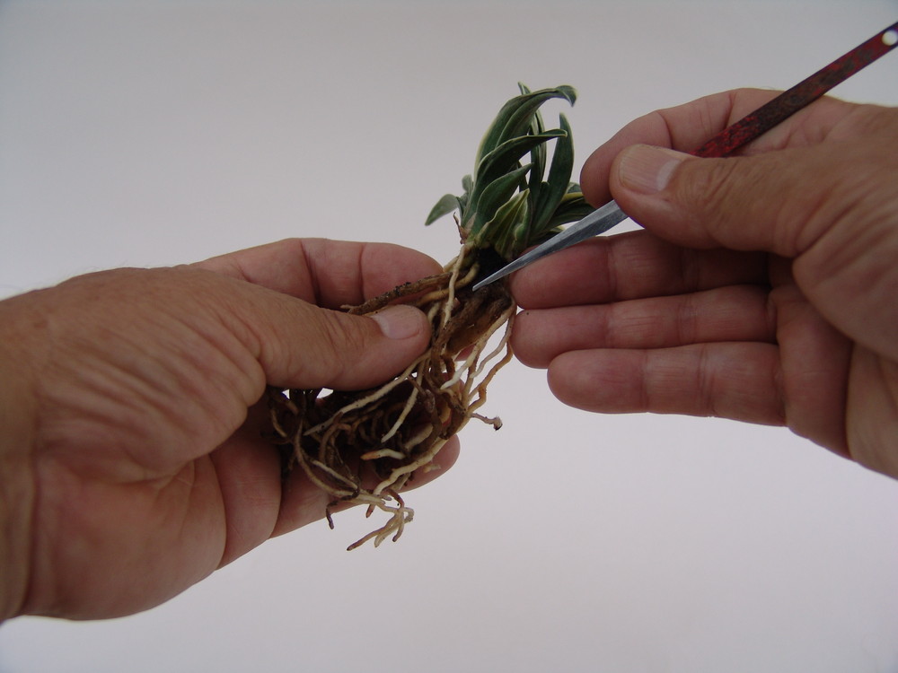 太い株の根元を握り両手で分ける。根の数や芋具合、痛み具合などを良く観察する。白い根であれば生育良好。
