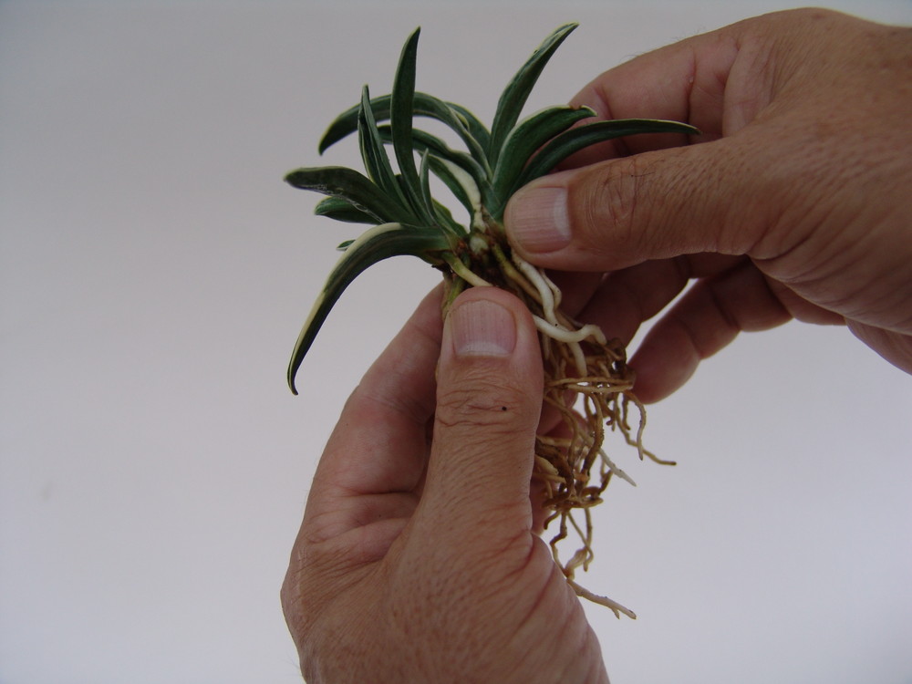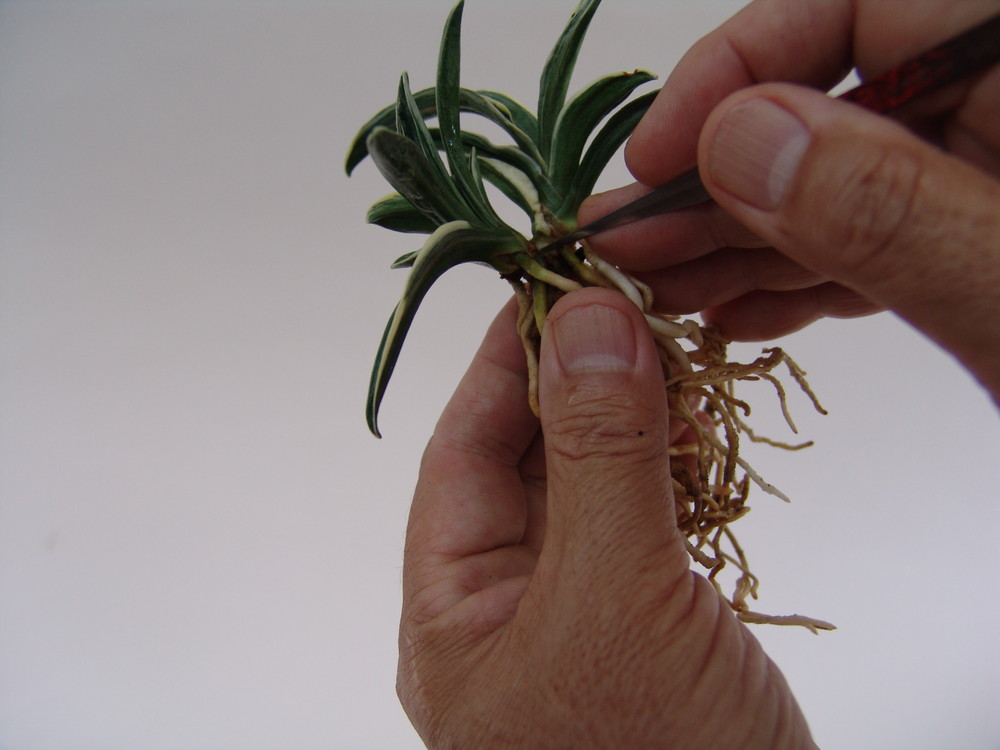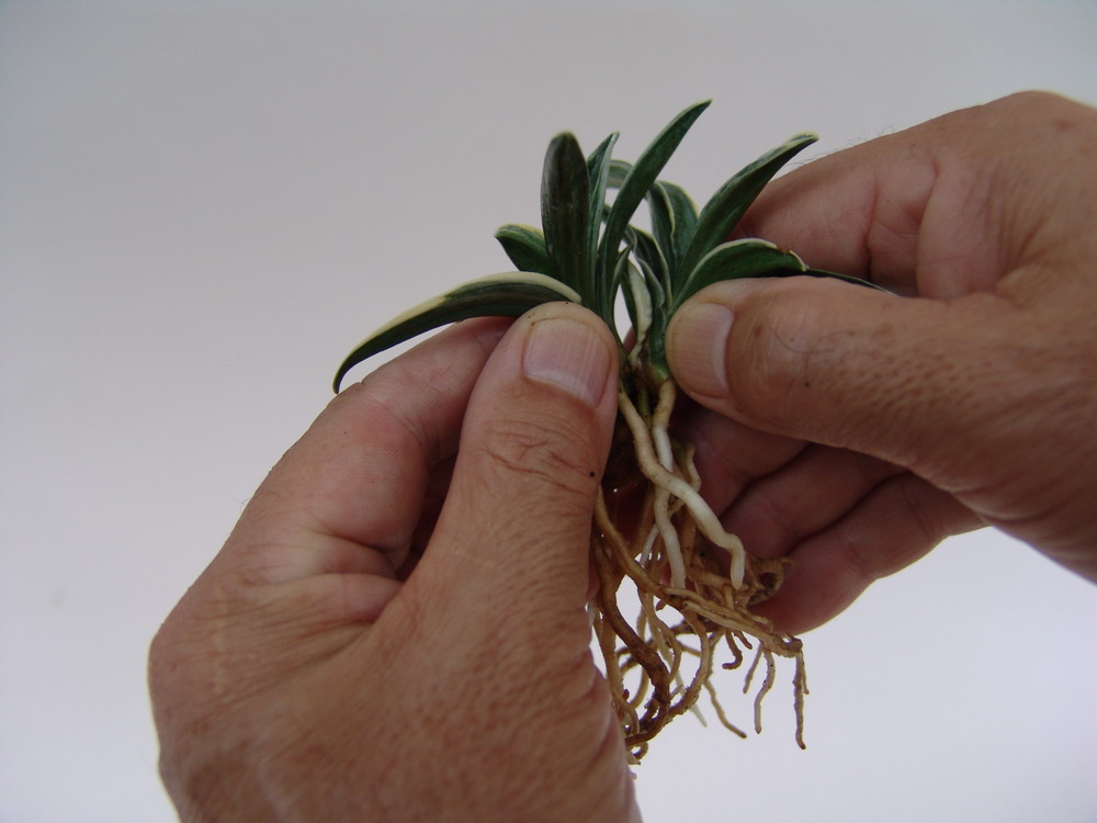 株分けの仕方、根元が分かるように水洗いする。古根を取り除いた状態にします。汚れた付着物を水で洗い流します。子の根が2本以上有るか調べます。