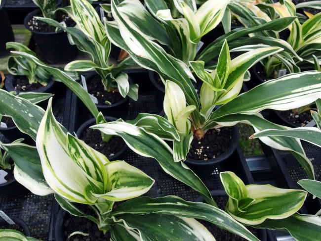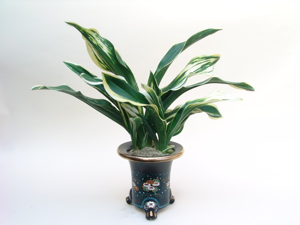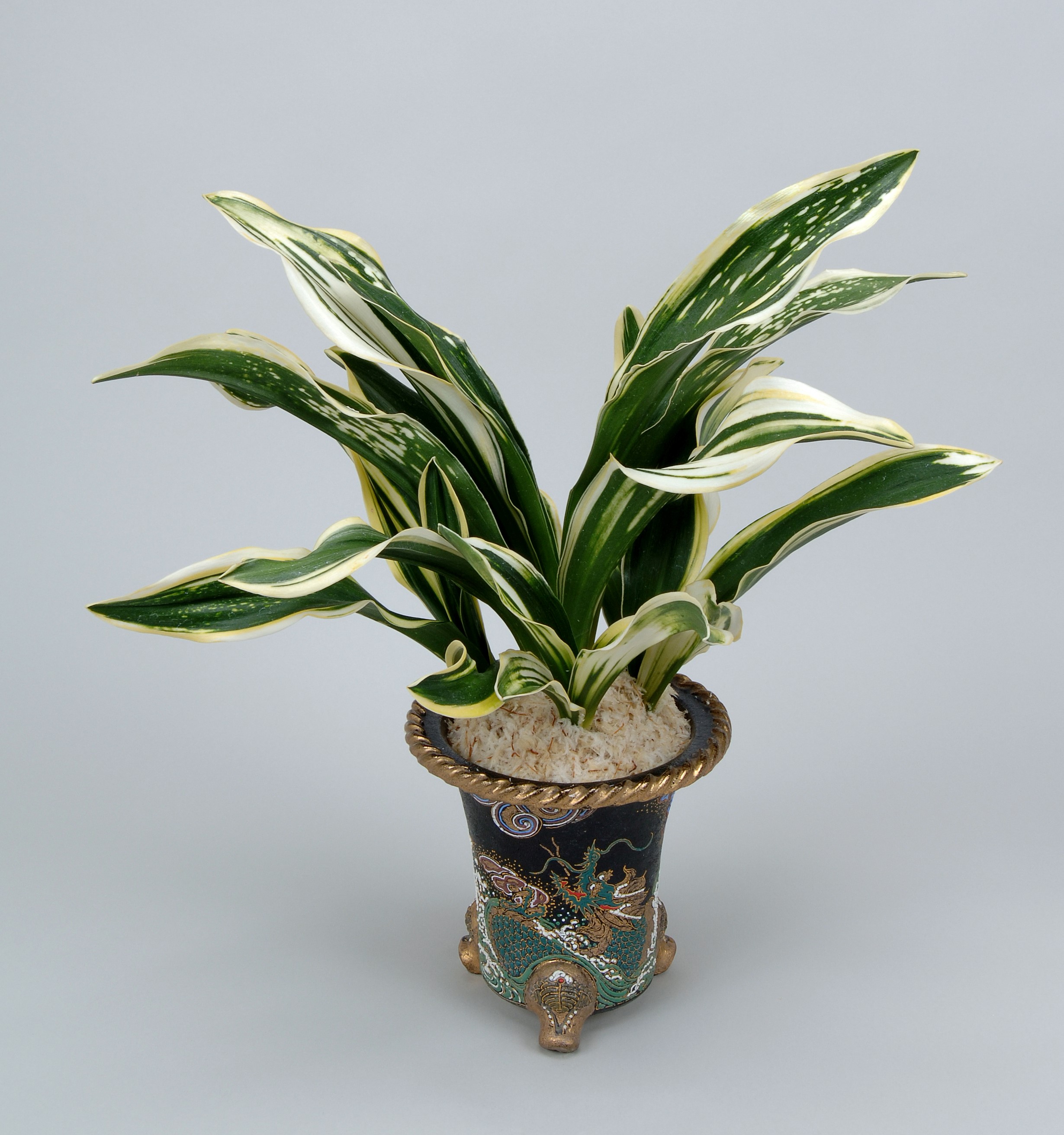 性質は強健で作り易く実付き良い品種。元木の太陽殿(たいようでん)は大葉覆輪を代表する人気品種。大きく深く入る覆輪と、波打ち、葉幅広くのび、葉先の尖る姿は美しい。大きく白い虎柄が現れ、華やかに太陽殿を彩る。太陽殿の濃紺と虎柄の相性も抜群。