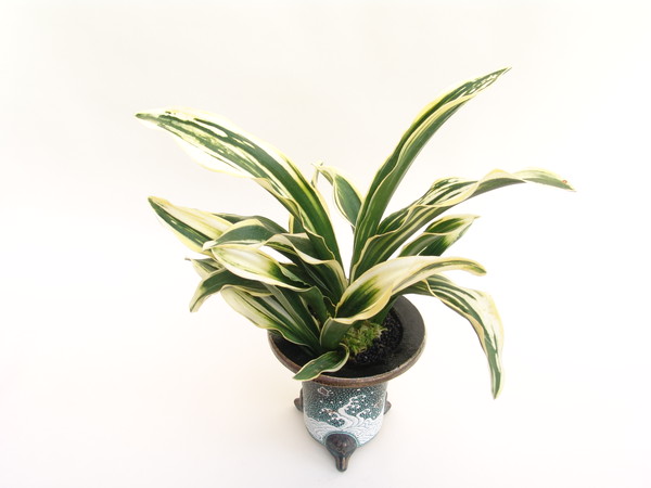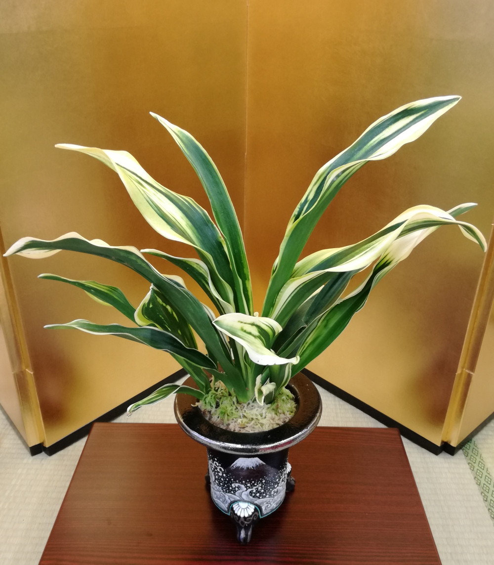 元木の太陽殿(たいようでん)は大葉覆輪を代表する人気品種。大きく深く入る覆輪と、波打ち、葉幅広くのび、葉先の尖る姿は美しい。大きく白い虎柄が現れ、華やかに「太陽殿」を彩る。「太陽殿」の濃紺と虎柄の相性も抜群。名前がよいので、家康公のように、引越しやお祝いに贈っても喜ばれます。おもとの中でも大きな種で、もちろん赤い実もたくさんつきます。地植えにも向く。おもとは一葉の中に森羅万象を現します太陽殿は堂々としたその姿から太陽の名にふさわしい姿。虎という白い大きな柄は、虎柄と言われ、虎にたとえられます。