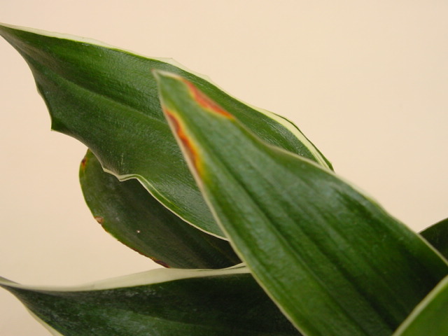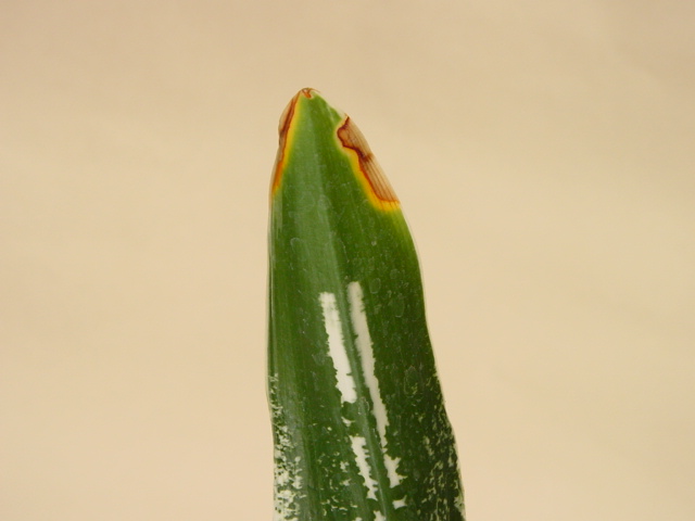 葉先や葉の縁に黄褐色の病斑ができて、やがて茶褐色に変化する。葉の中央部での発病は少ないようです。葉の薄い薄葉系統・大葉系統に多く見られます。