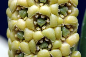 【花芽】がでてきたら、チャンスです。花芽が伸びきって、クリーム色から黄色に変わっていくときにおしべをめしべにつけてあげましょう。おもとは自分のおしべとめしべでも実がなりますが、他のおもとのおしべの方が実がつきやすいです。