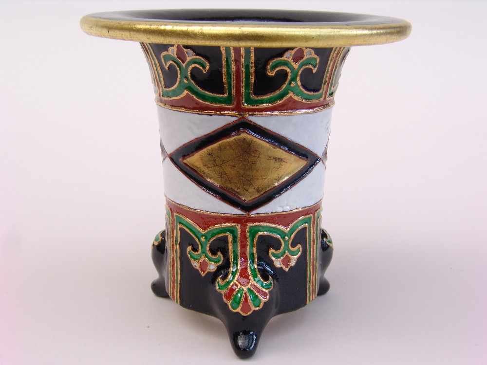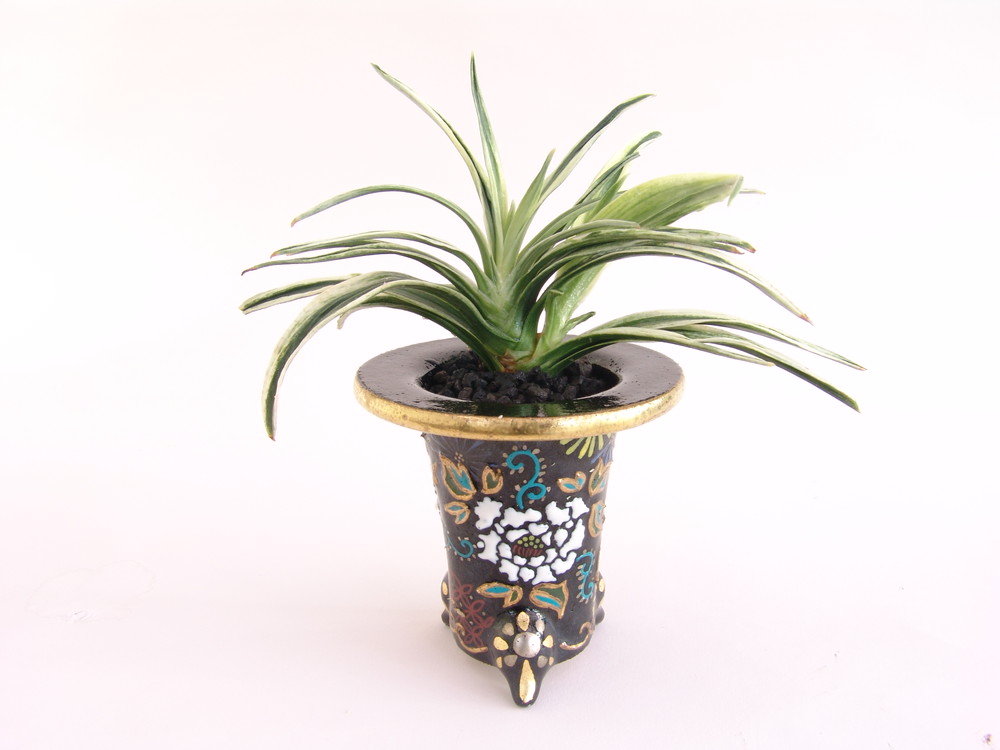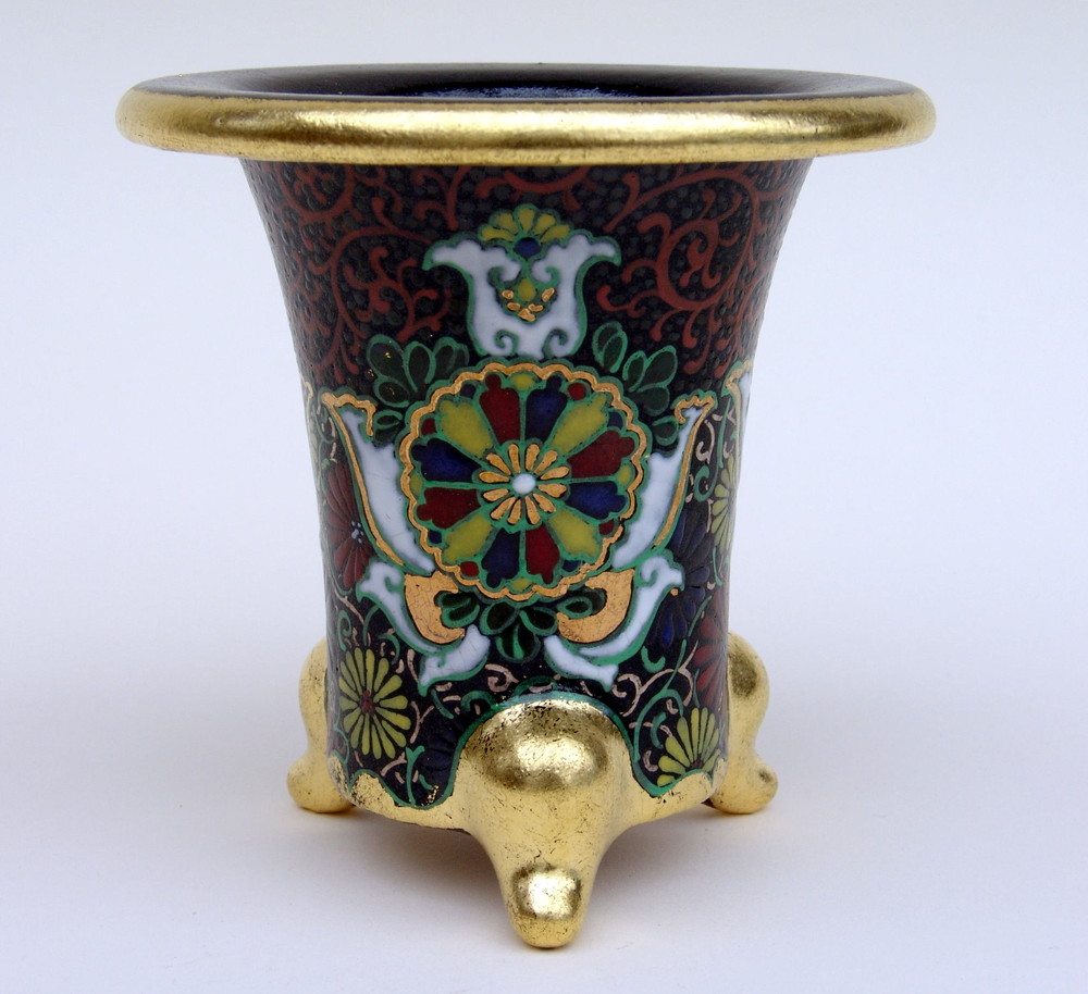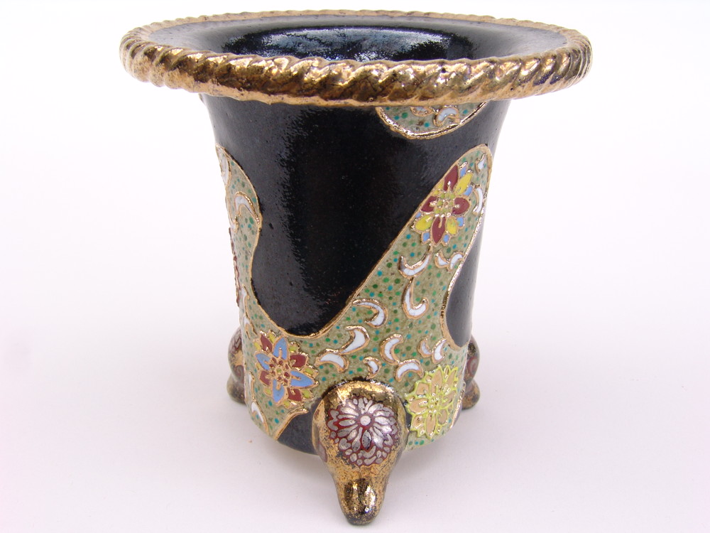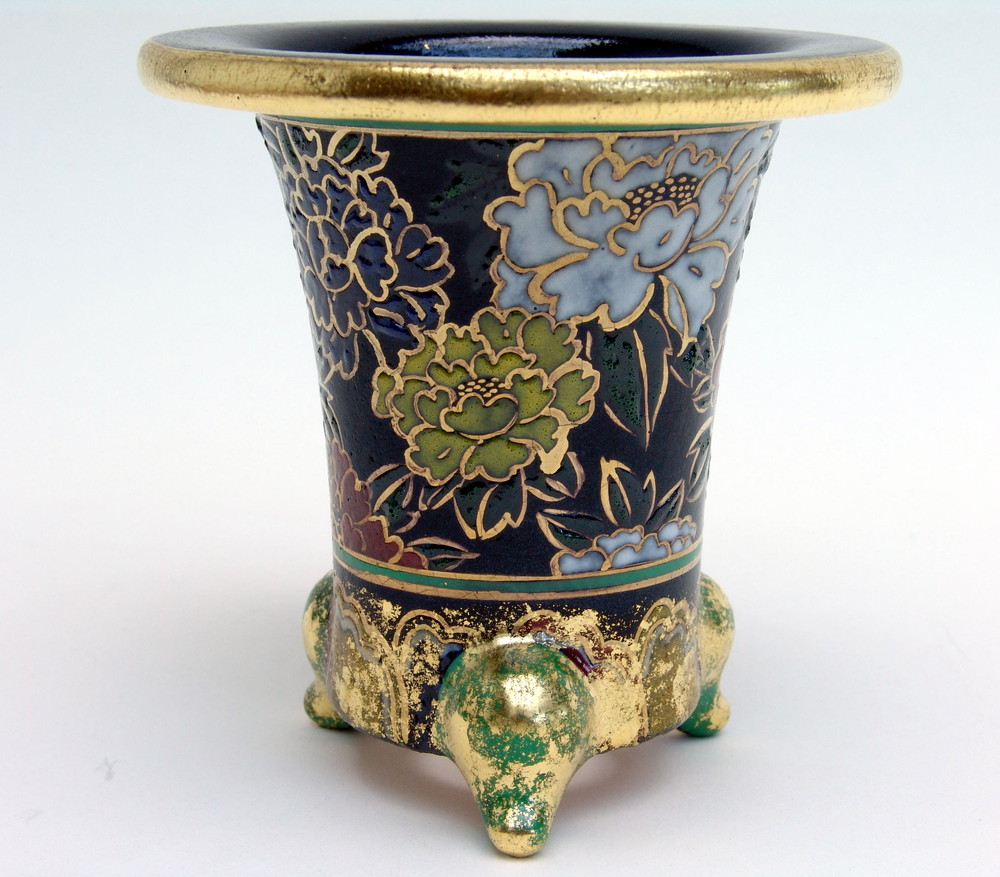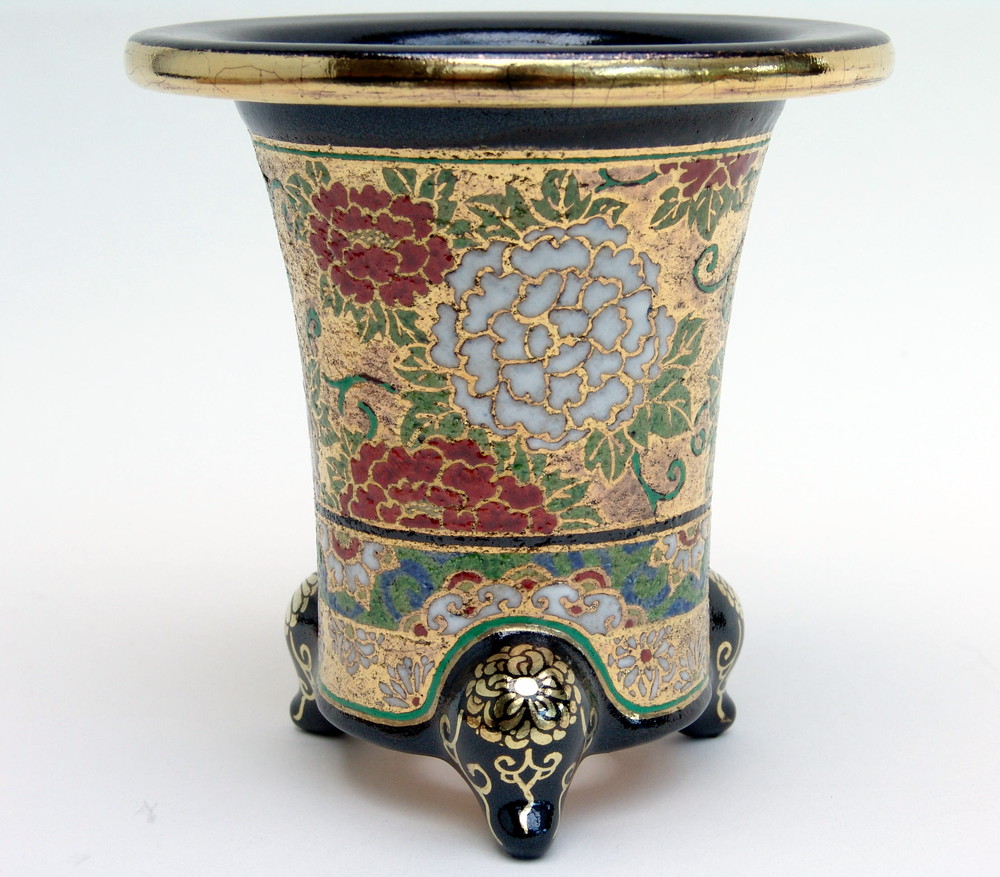 賀茂黒の味がでています。非常に緻密で細かい仕事が施されており、地の賀茂黒、緑、金の縁取りに牡丹と重層的な美しさがあります。作者は色にこだわりがあり、緑にも、白にも青、黄、赤とどれも何色ももっていて、ベストな色を選んでいます。鉢ごととはいきませんが、この鉢のためだけの色があります。足や縁の金は金箔そのものをはっていて、例えばプラ鉢や黒鉢をブラシで洗うようなことはさけてください。本物にこだわる人向けの鉢です。