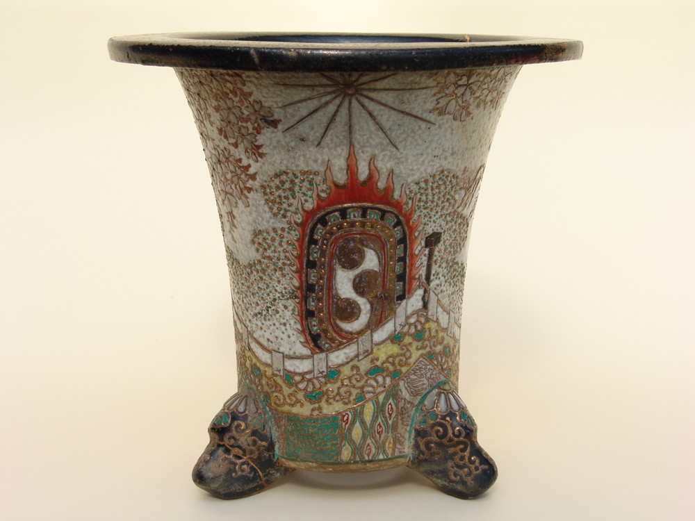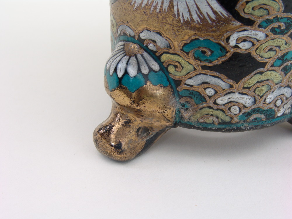 昭和三年に新潟の石油王中野忠太郎氏に1万円にて譲渡された有名な写真ですが、その時の記念の写真と龍の構図をほぼ同じに破れ亀甲が三色の雲と対応するように描かれています。これらからこの出来ごとの前後か、鉢の状態からもう少し古いものではないかと考えられています。