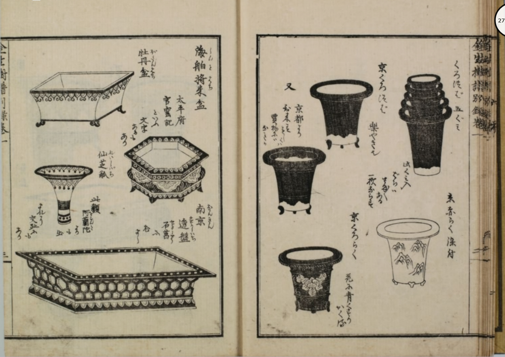 現在の万年青鉢の原形が、天保中期にはすでにできていた。天保[文政の後、弘化の前。 1831年から1845年 この時代の天皇は仁孝天皇。江戸幕府将軍は第11代徳川家斉、第12代徳川家慶。]