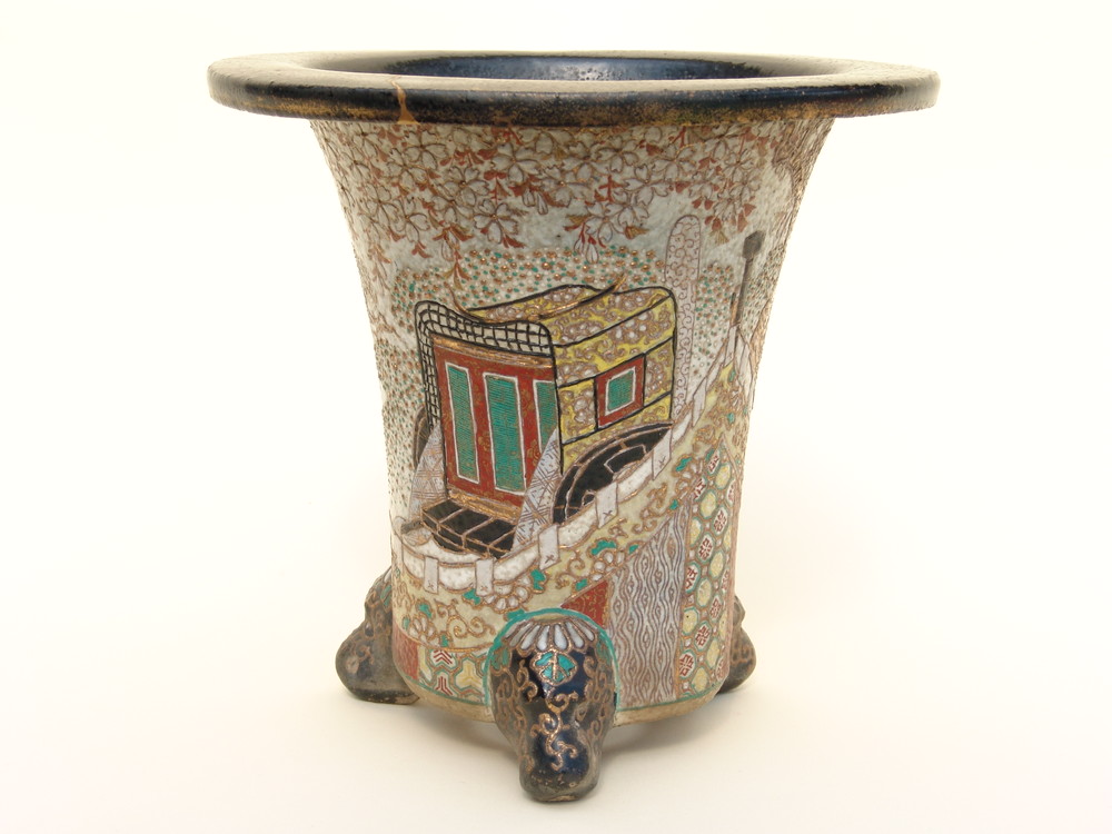 春の麗らかな桜咲く日の御所車という晴れやかな情景を描いている。五色の幕も亀甲や唐草、立湧といった吉祥柄を組み合わせたもので全体が明るい雰囲気に仕上がる。現代の名作家布施覚氏もこの鉢を写して春と秋の御所車を完成させている。東京の有名な歯医者さんが豊明園2代目淳蔵と仲が良く、特別に分けて頂いたもの。この古鉢が特徴的なのは金継ぎです。日本ではものを大切にする文化がありますが、割れてもこうして大事に使ってゆくことで鉢の価値もまた高いものだったのでしょう。