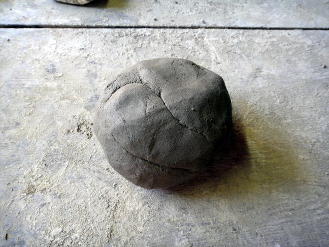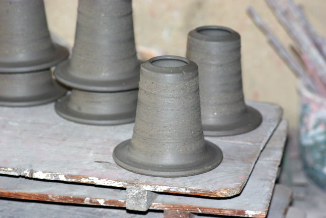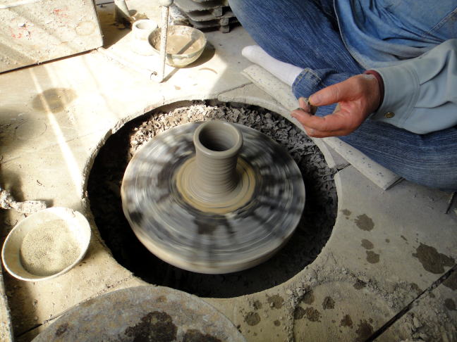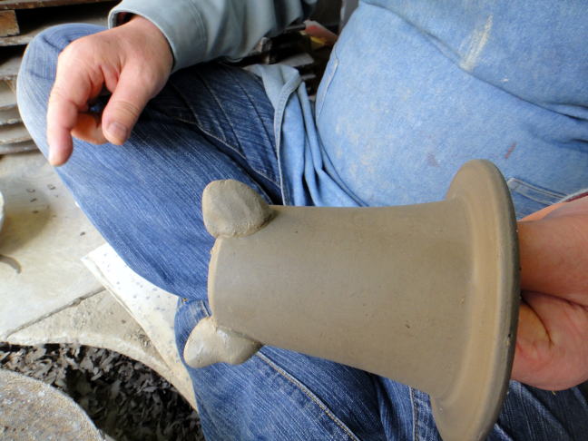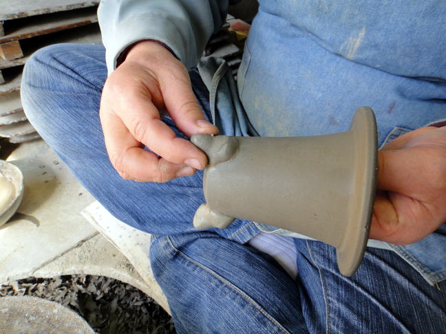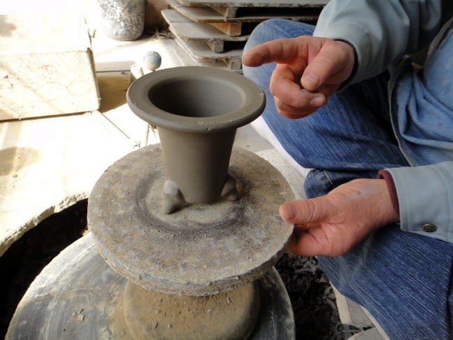 鉢製作で難しいのは足を付けるところ!上の土の塊をいとも簡単に足にしていきます。