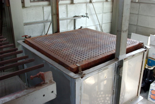 そして、楽焼の特徴、急冷。隣に水を張った水槽が用意してあり、急冷します。急冷によって艶やかな黒色の発色と土の焼き締めを防ぎ植物の生育に適した良い鉢が出来上がります。