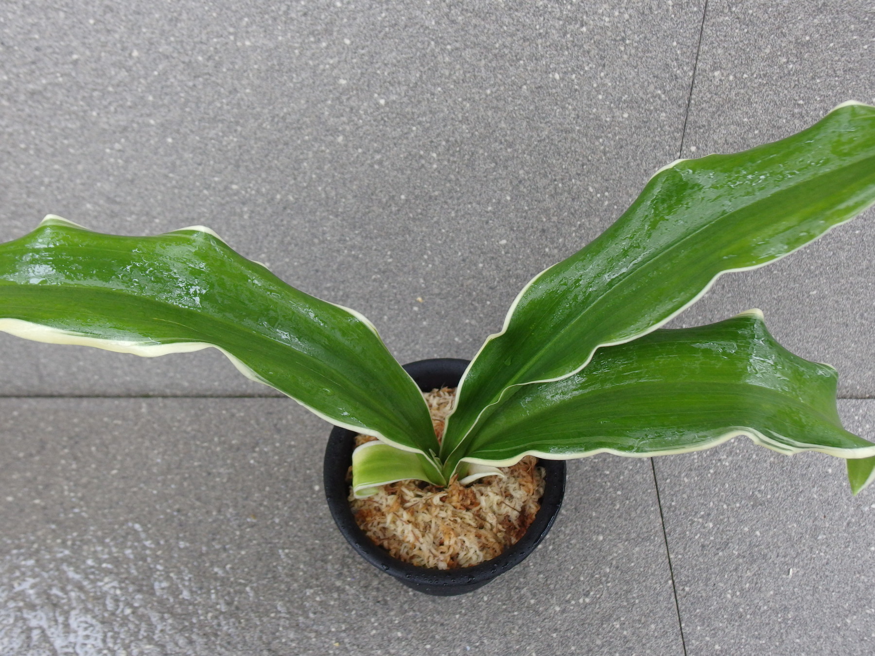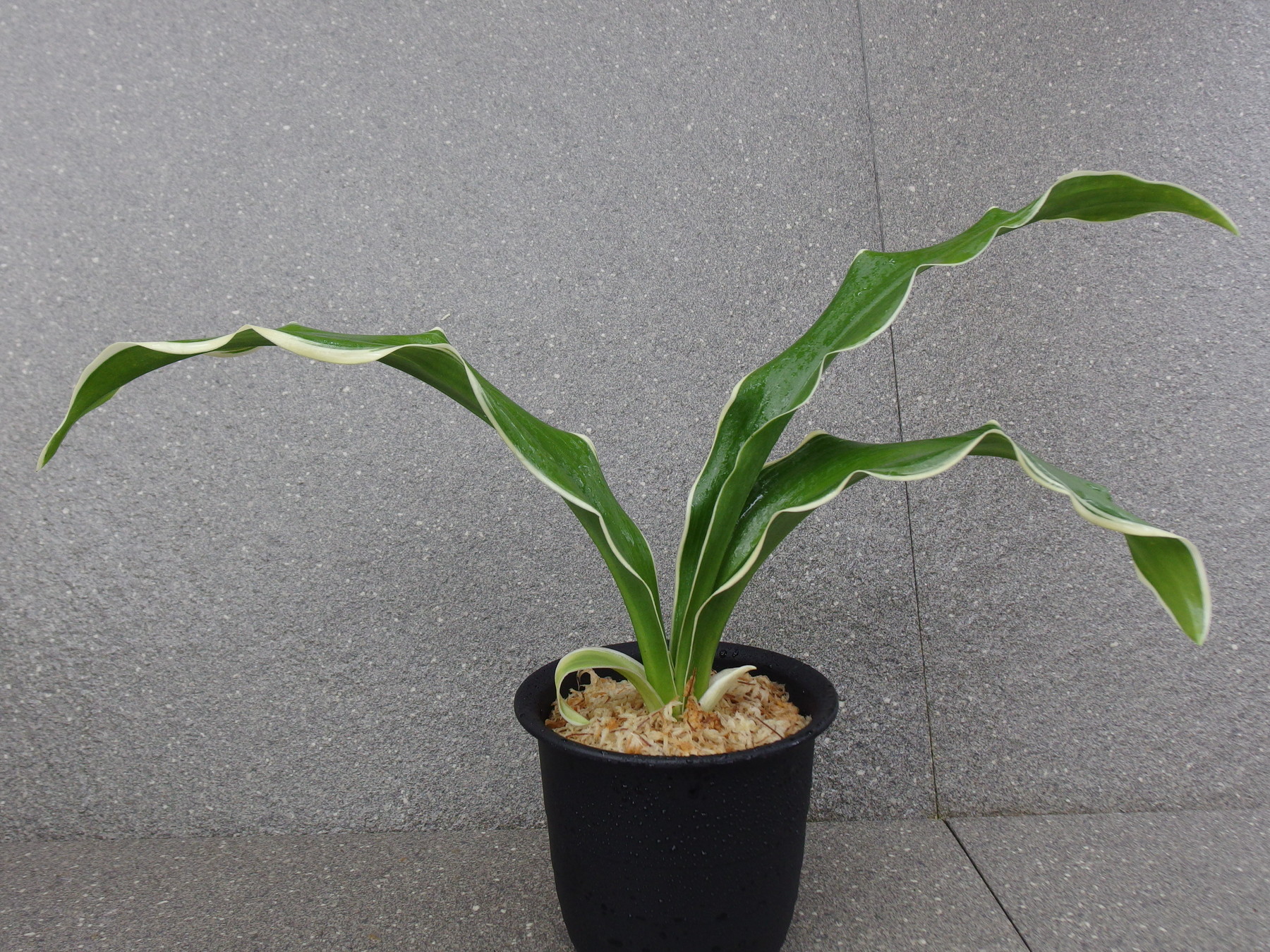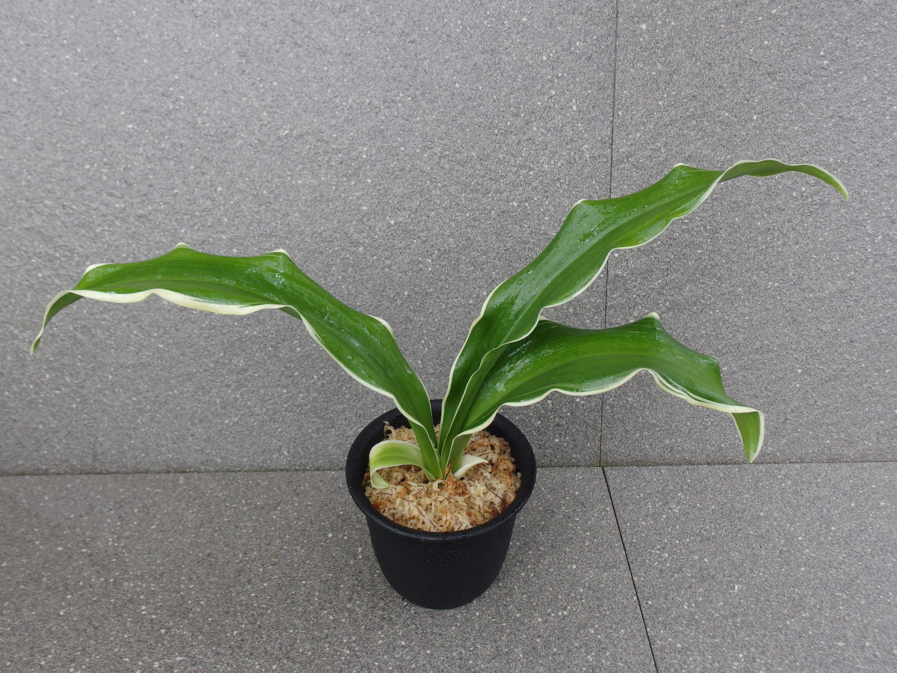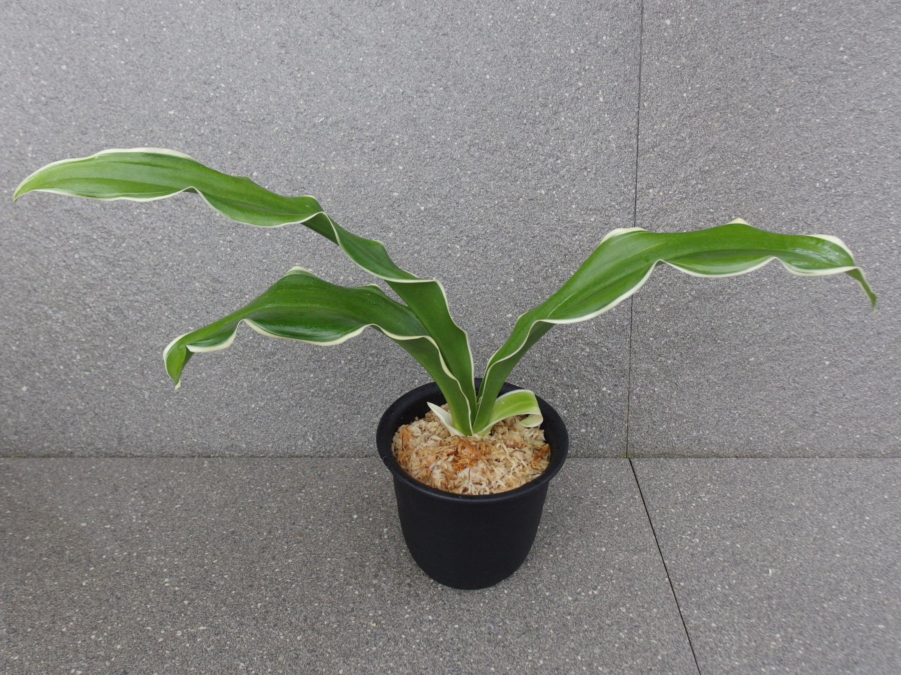 葉には白い覆輪を見せます。薩摩万年青の丈夫な代表品種。