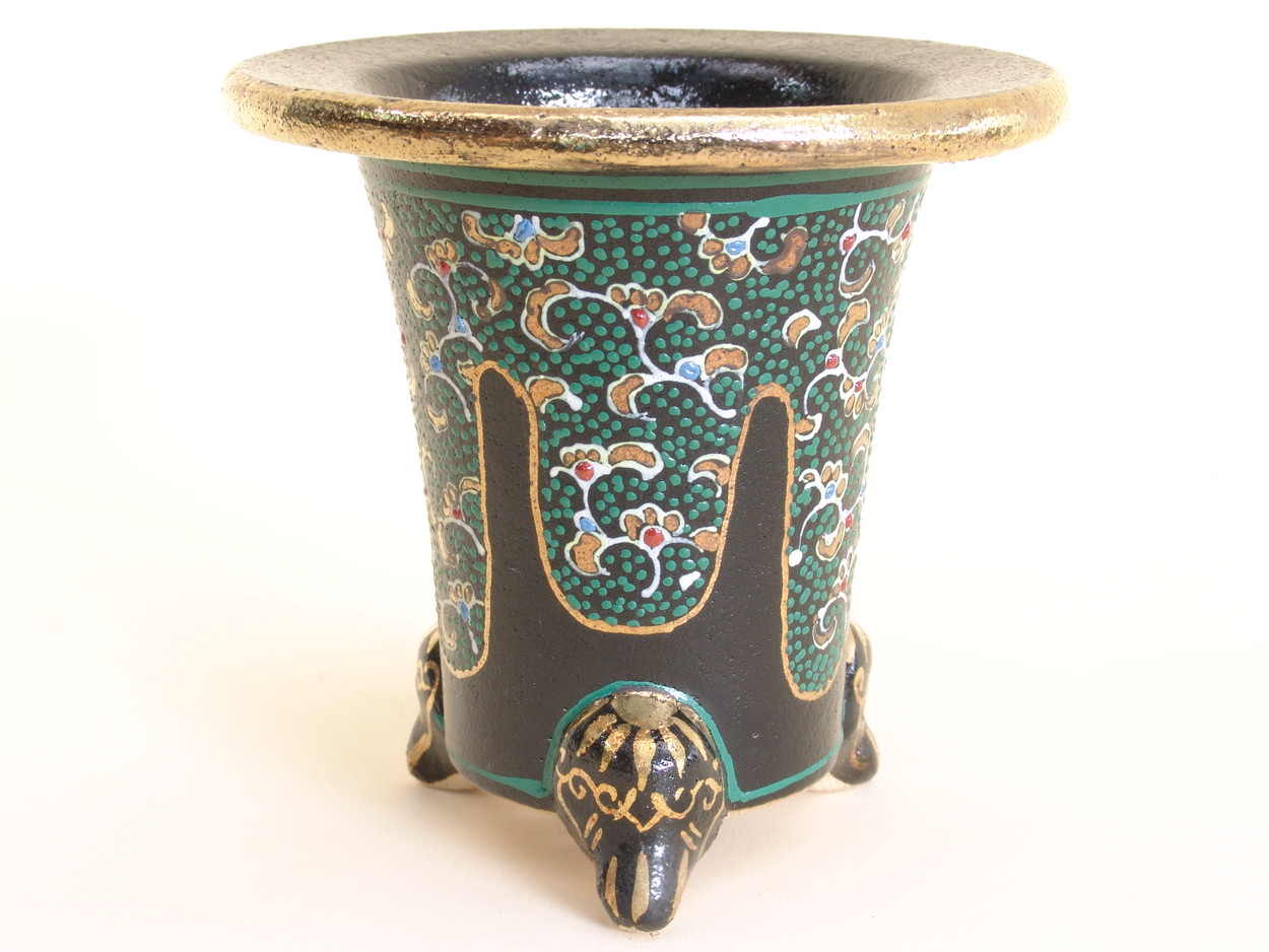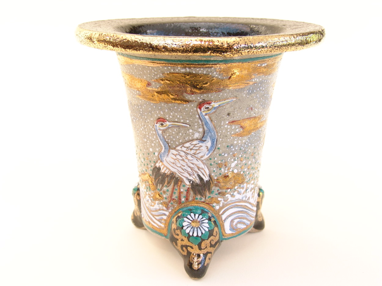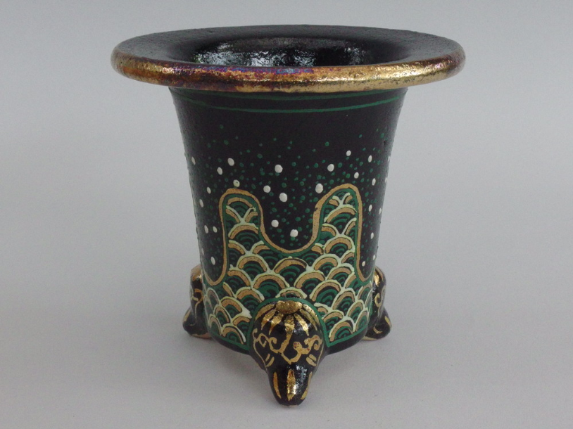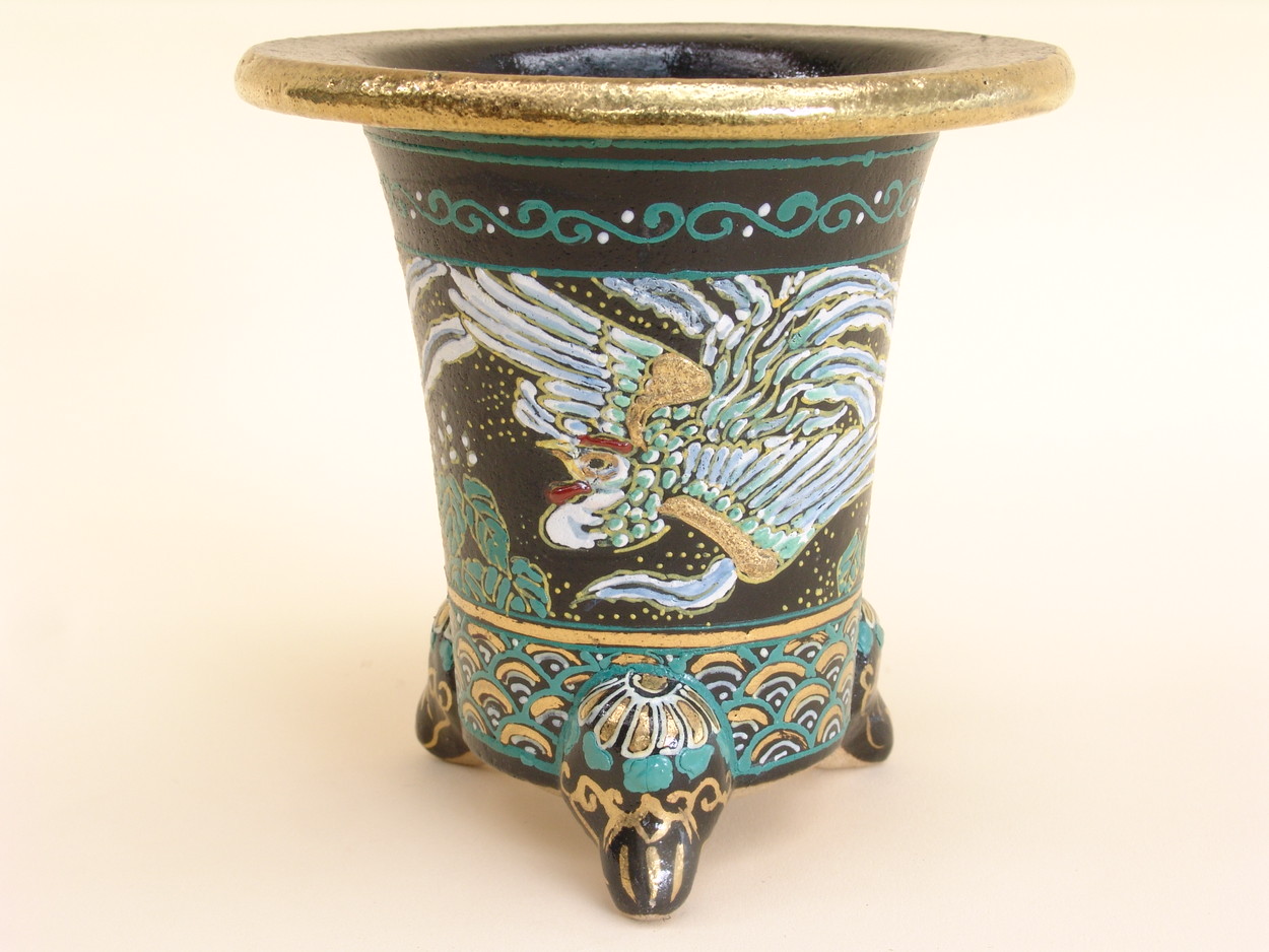 昭和50年、地元の山口に帰り、万年青園である一水園を開いた後、そこに窯をもち、絵付けをされていました。一水氏は絵かきとして、鉢は黒鉢を仕入れ、そこから自分で絵をかいては何度も焼き付けをして、錦鉢を製作します。最初は手探りで、独学で色を覚えて絵付けをし、その鉢をみた愛好家が是非分けてくれといわれ、名が広がっていきました。