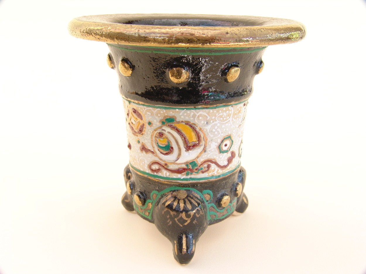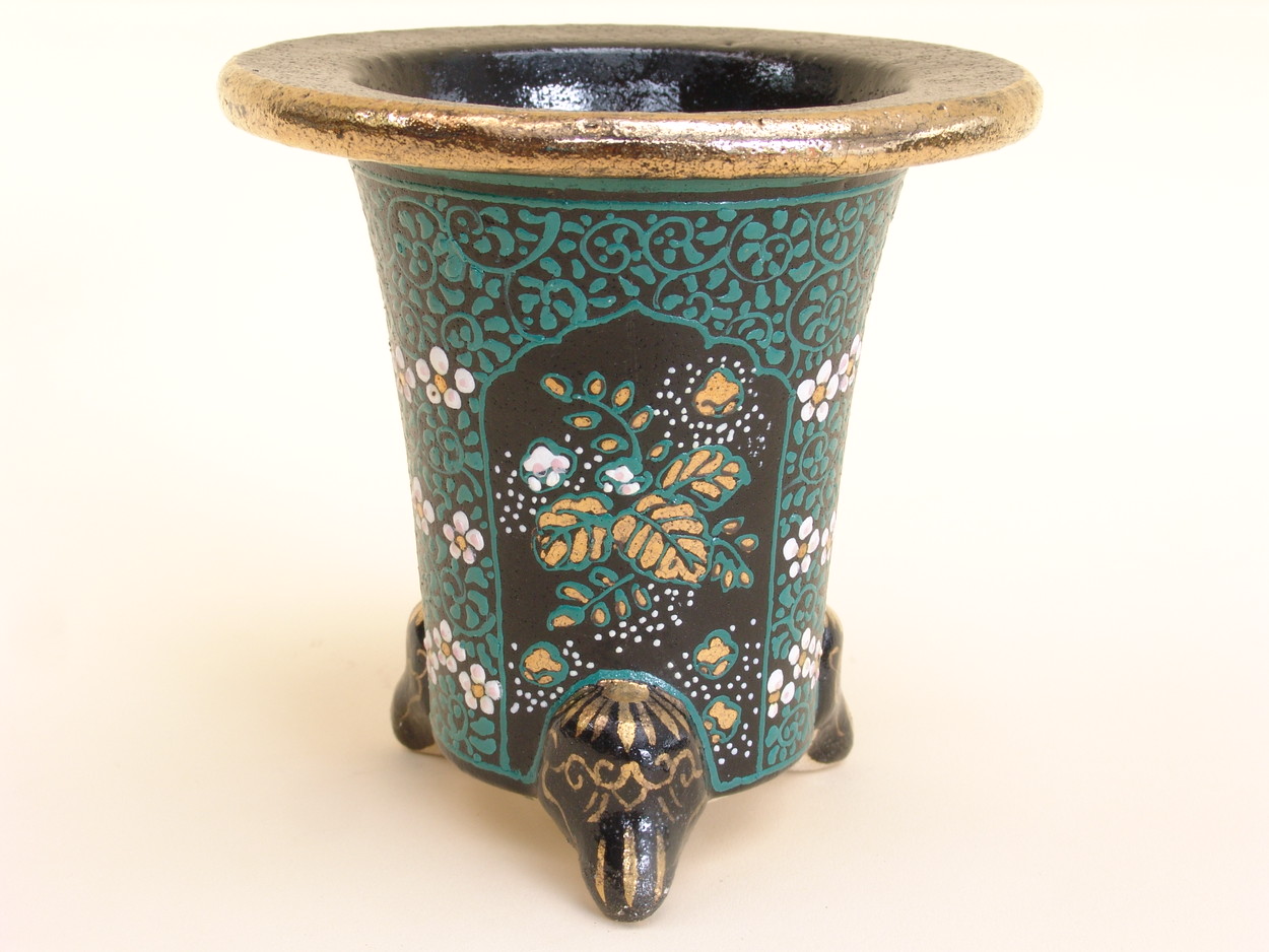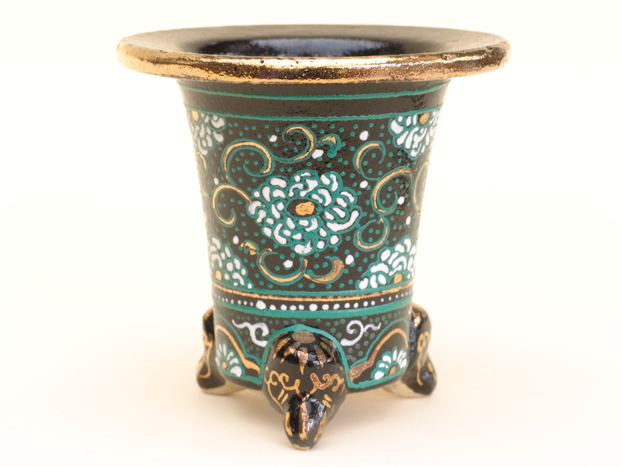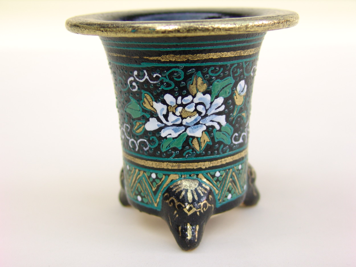 昭和50年、地元の山口に帰り、万年青園である一水園を開いた後、そこに窯をもち、絵付けをされていました。一水氏は絵かきとして、鉢は黒鉢を仕入れ、そこから自分で絵をかいては何度も焼き付けをして、錦鉢を製作します。最初は手探りで、独学で色を覚えて絵付けをし、その鉢をみた愛好家が是非分けてくれといわれ、名が広がっていきました。