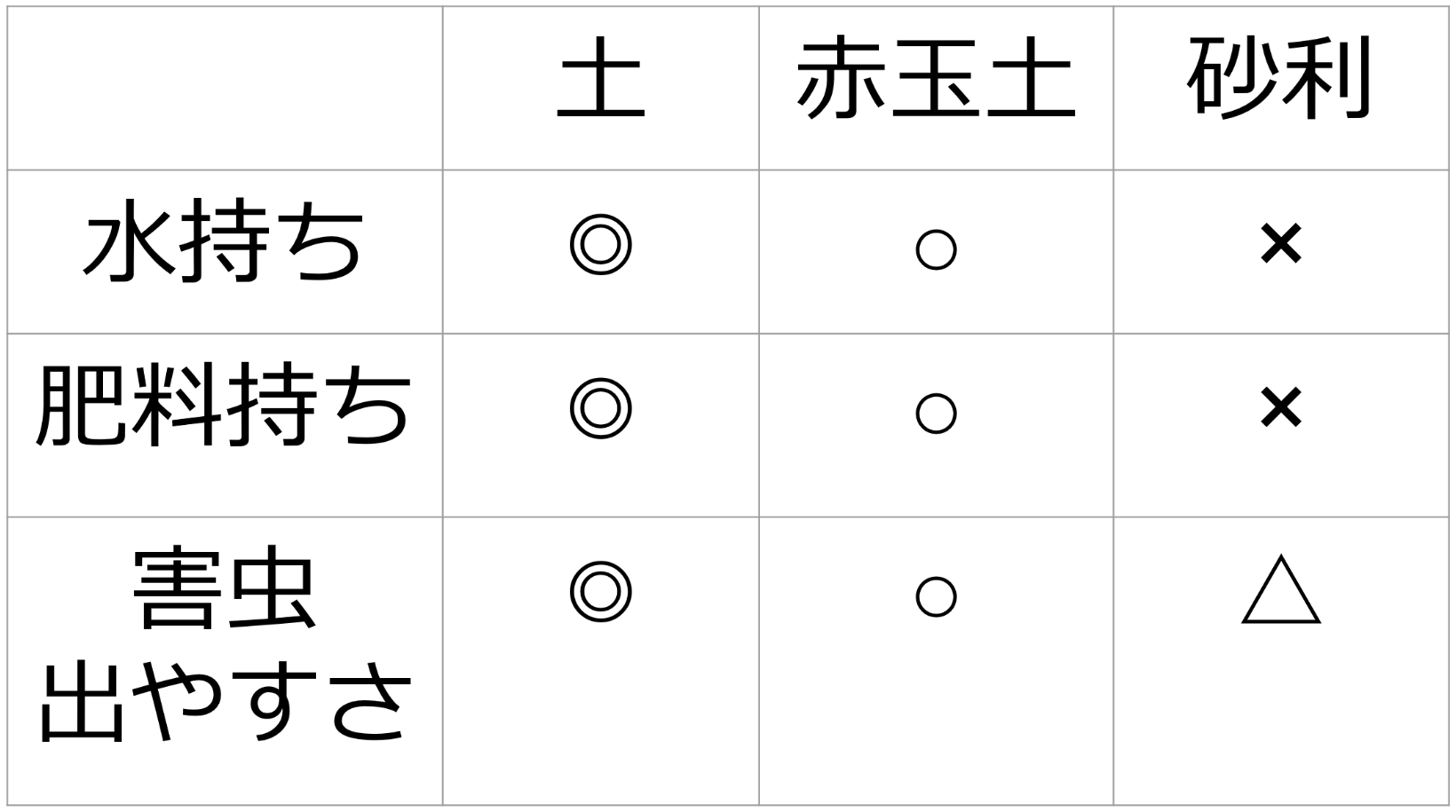 土は一番水持ちがよく、肥料持ちがよいです。そのため、水やりの間隔もとても長いでしょう。土の中に肥料を持ちやすいのと、腐葉土などが入っていれば、すでに肥料を持っているのも特徴です。そのため、害虫も紛れていることも。