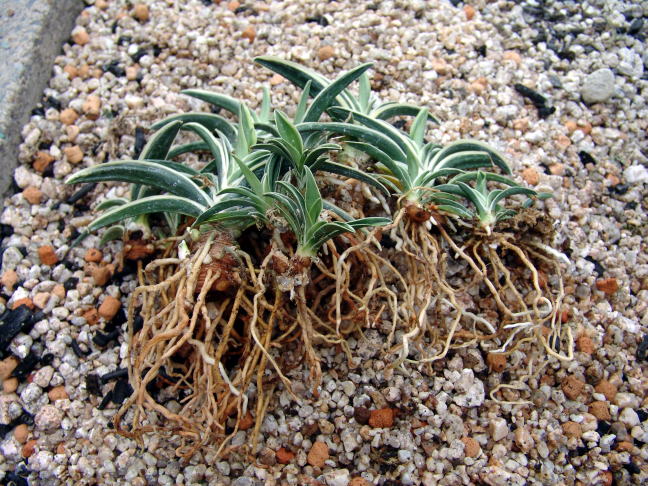 土や赤玉土では、水持ちがよい分、根の伸びはよいでしょう。どちらかというと、棒根という長い根が出やすいです。どの用土でも、乾きがよいと、枝根をたくさん出します。