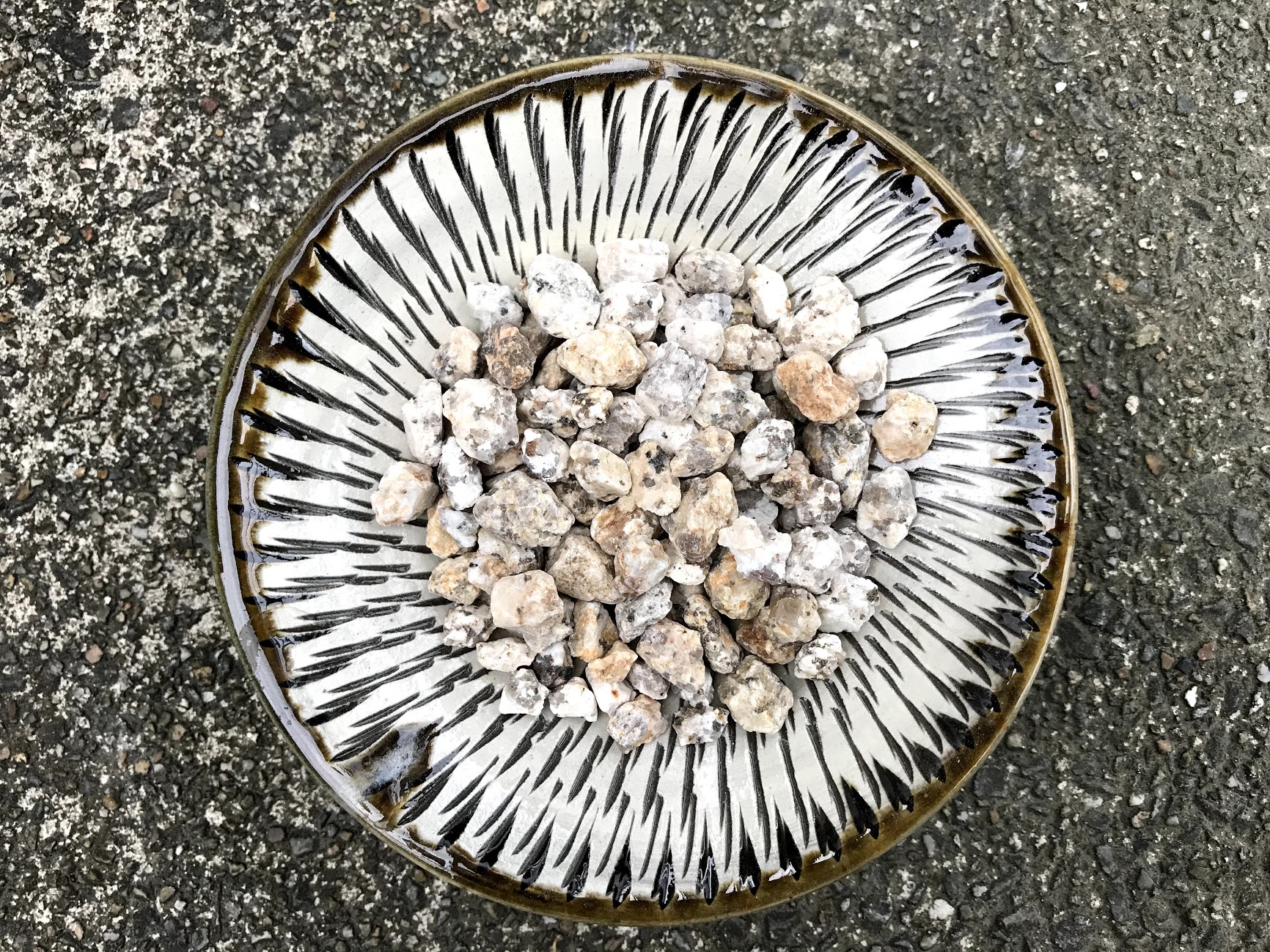 化粧土、黒くて重たい火山砂礫、見た目美しく水を吸収すると真っ黒くなり万年青を引き立たせます。乾いている時は灰色ぽくなります。保水力は良いが、乾きやすい。水の通りがよく、雑菌・バクテリアの繁殖を抑えるので、灌水した水の腐敗を防ぎ、根腐れもしにくくなります。