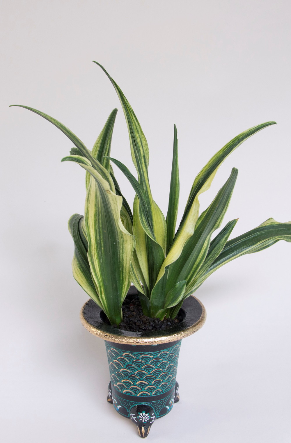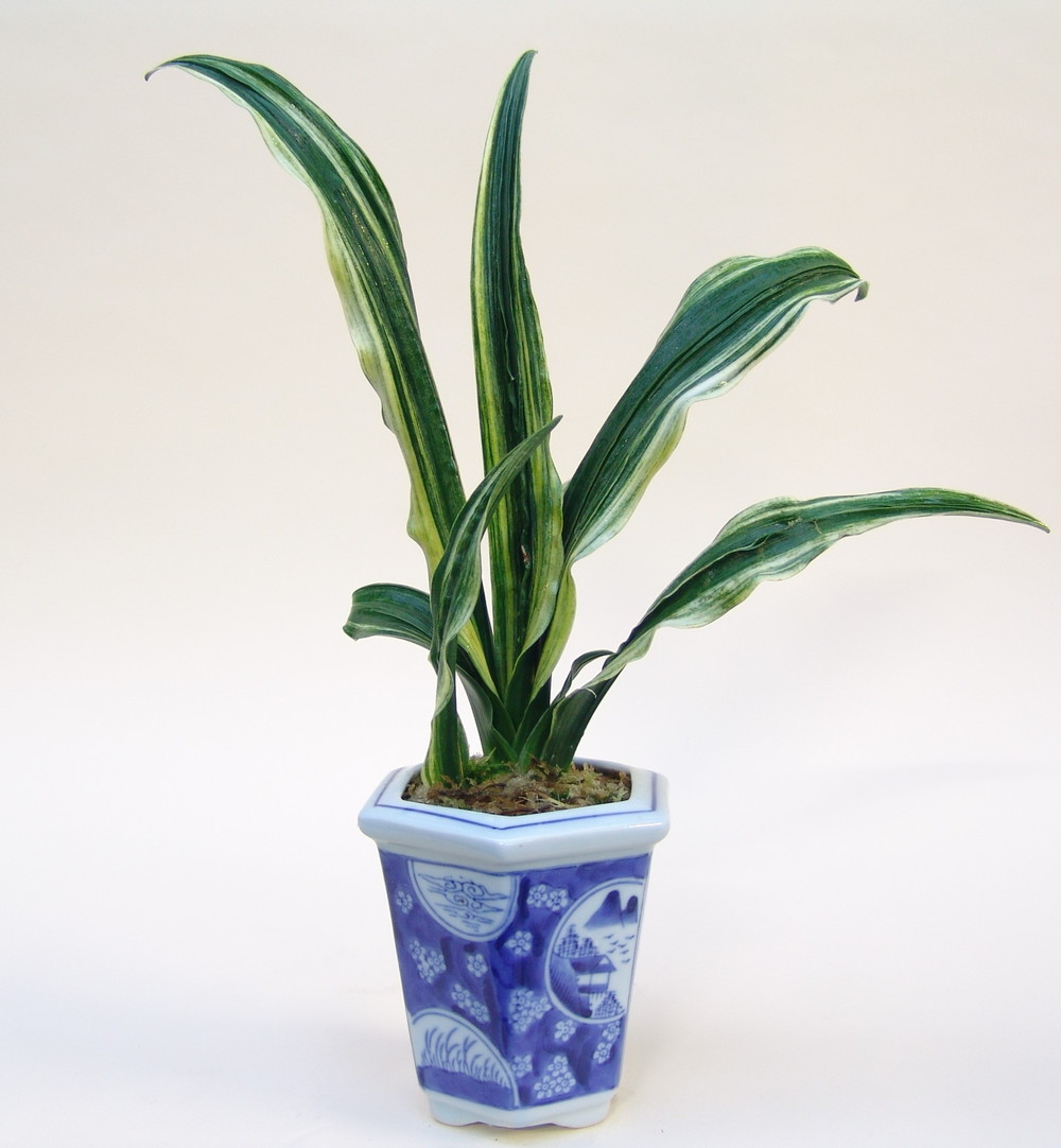 江戸時代、原種のよく見る青いおもとが主だった時代、この『日月星』の姿は品があり、葉の美しさは武士道にもかない喜ばれ、おもと数寄者 趣味者を魅了しました。この『日月星』が素晴らしいのは形、芸というだけでなく、実をまいてもこの独特な日本刀のような葉がでないことが人気の続く要因でした。