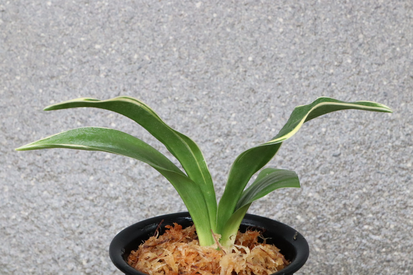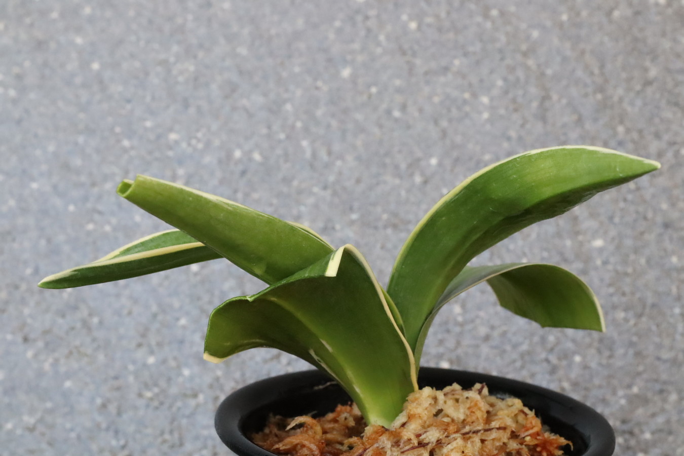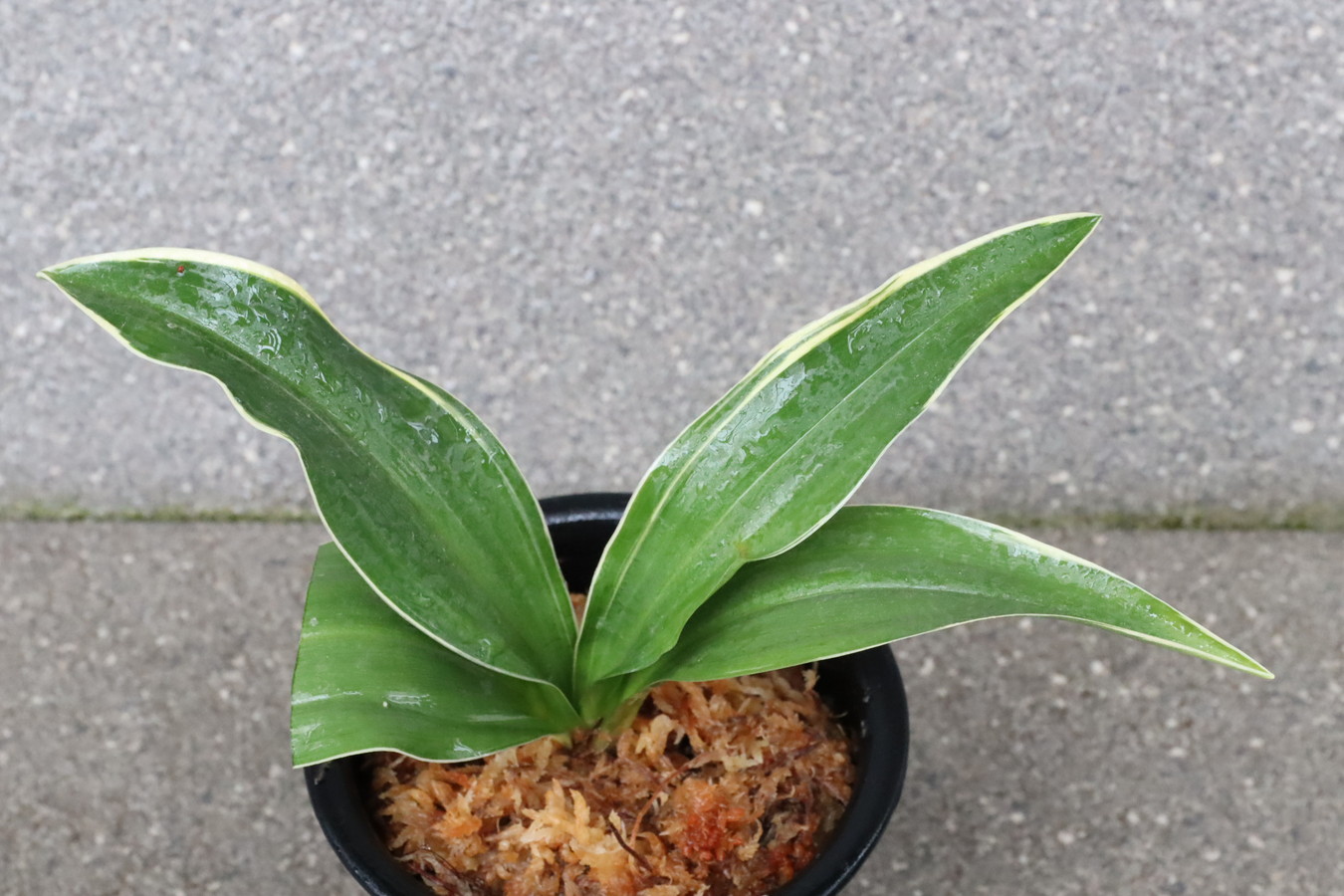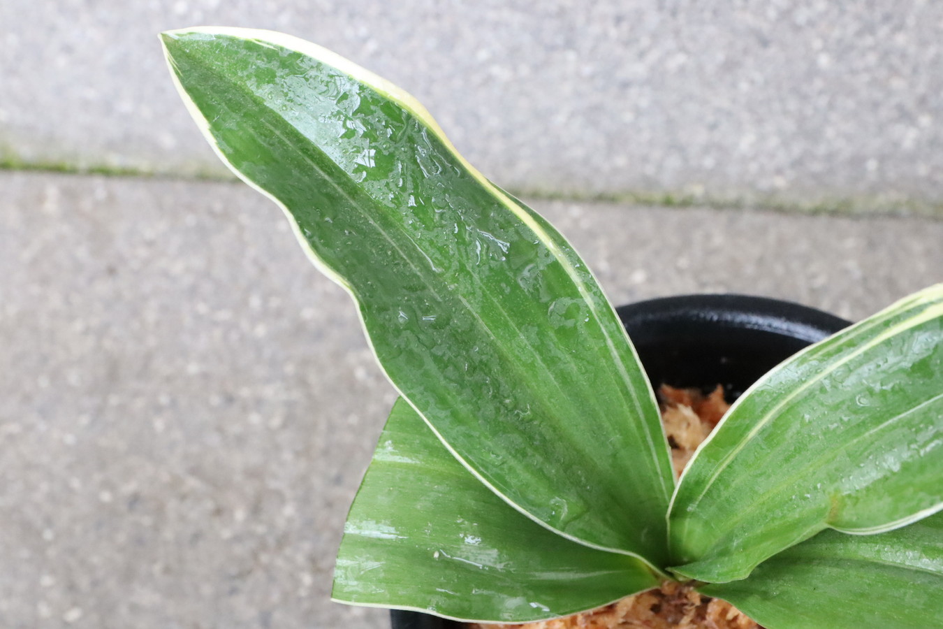葉巾広い濃緑色葉に黄白色の深覆輪を見せます。