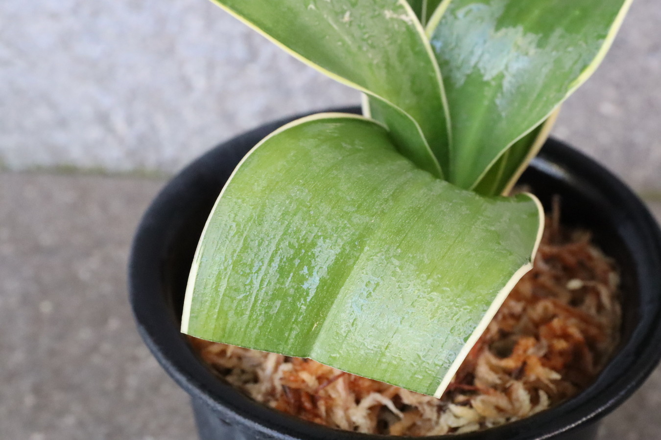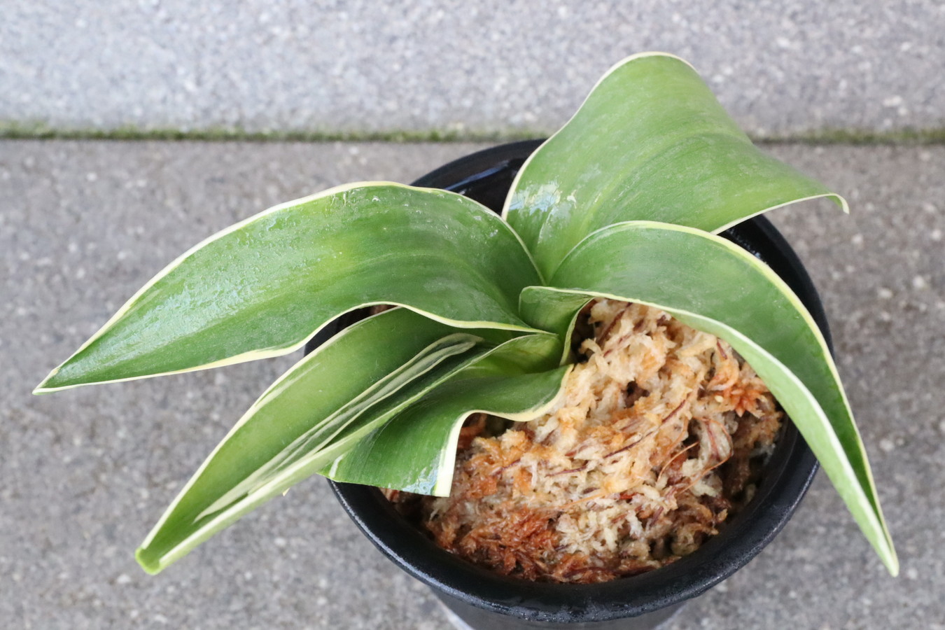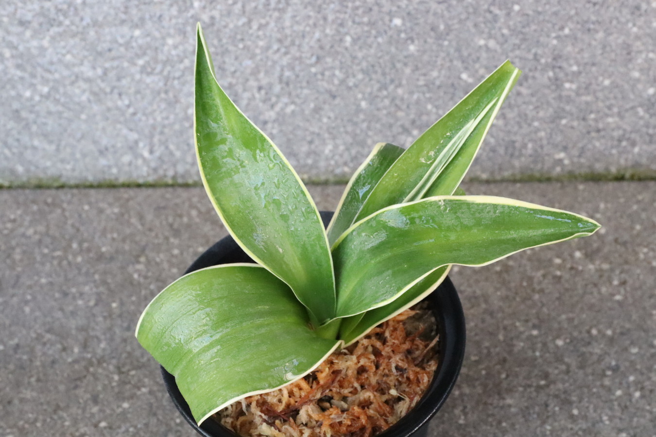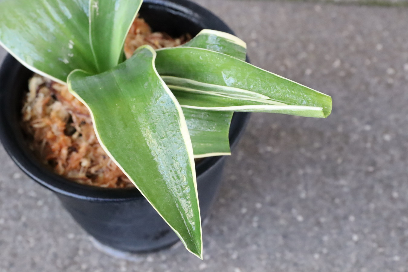 葉巾広い濃緑色葉に黄白色の深覆輪を見せます。