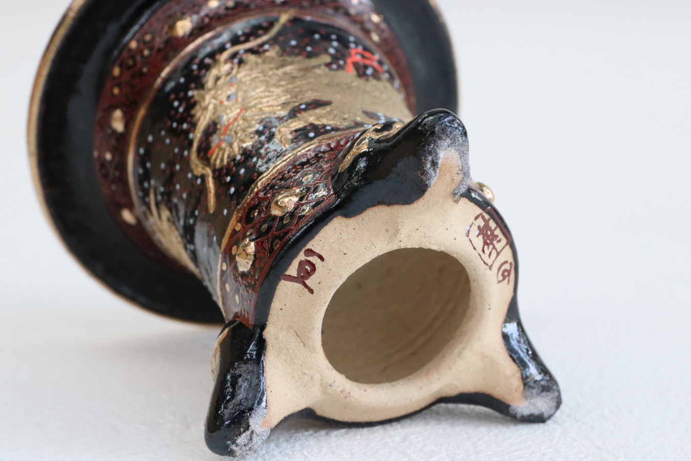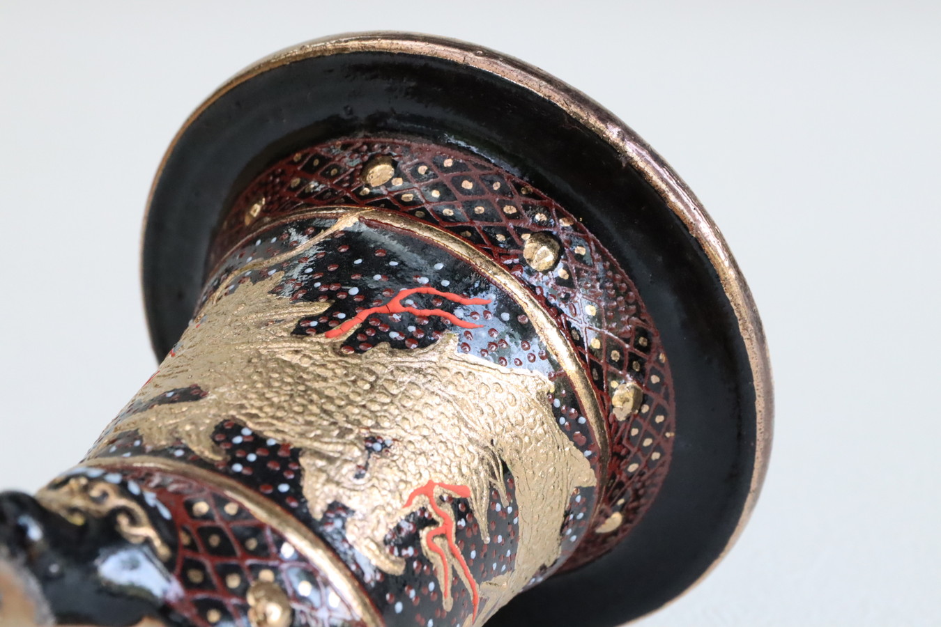 2477,特級 加茂黒太鼓胴 金龍 萬年青楽鉢 外径約10.3cm 亘サイン 華サイン 合作の傑作