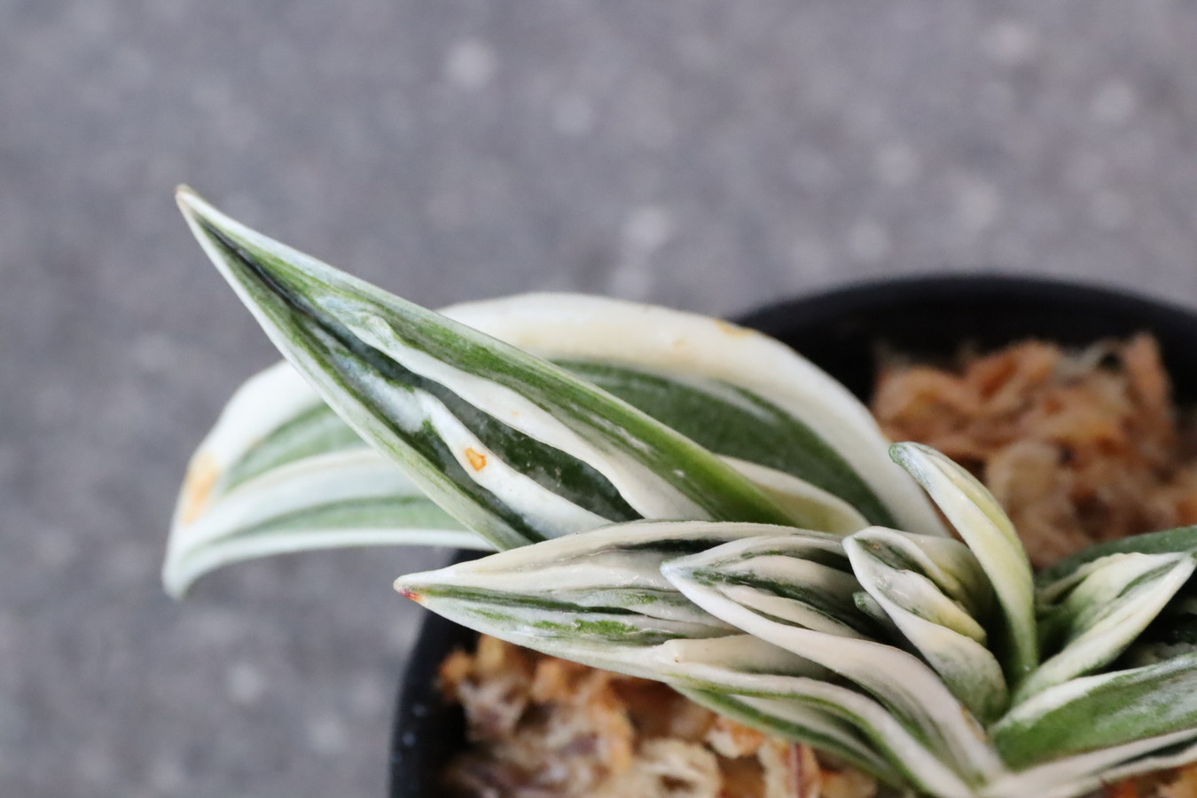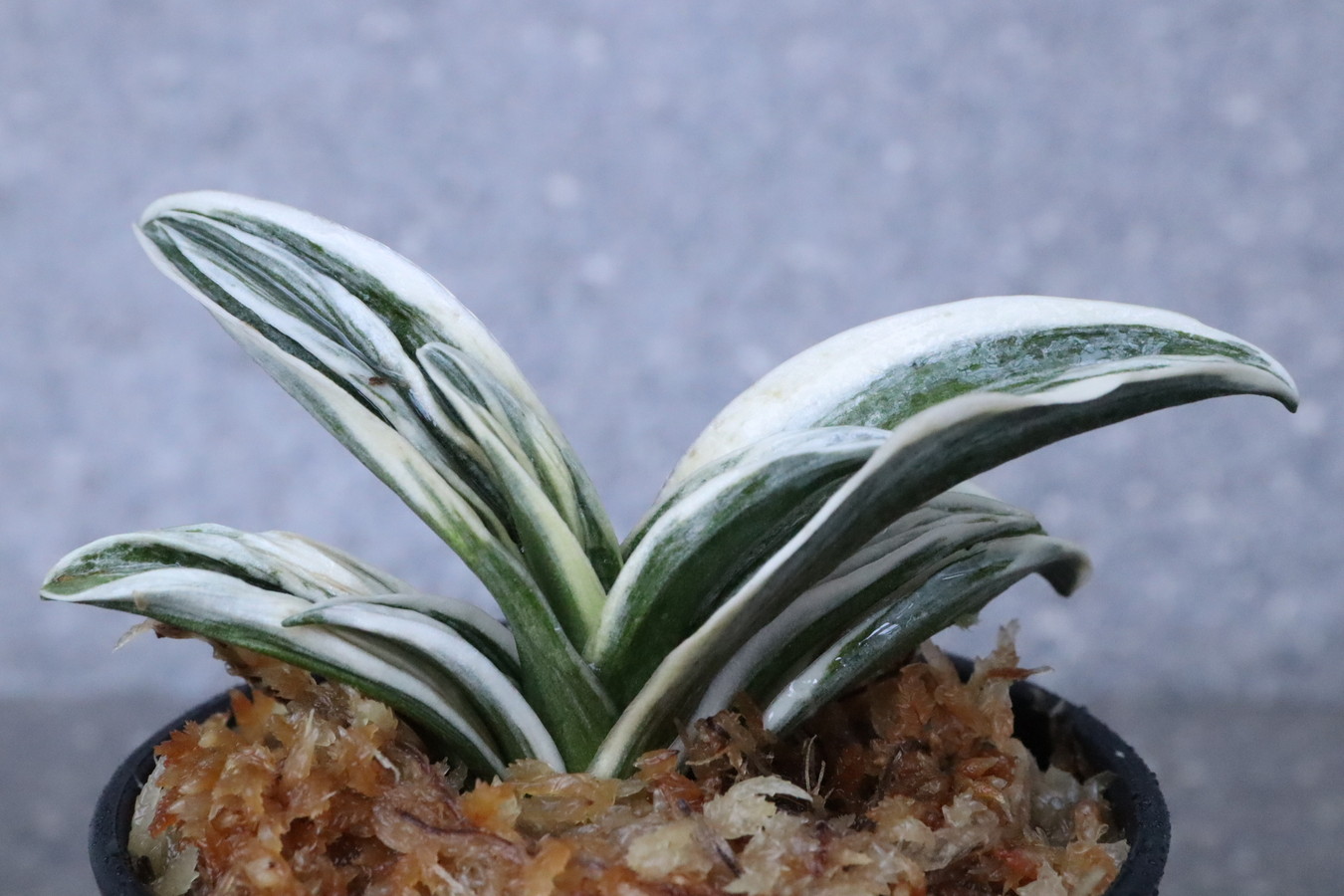 葉肉厚く丸葉型。濃緑色の艶消し地の広い葉幅に葉全体を覆う白い総雅糸竜を現す姿は力強く、どっしりとして容姿は迫力を感じさせる。若い頃から覆輪は深く、陽を採り総雅糸竜を引き出したい。肥料を強くすることで葉幅の広い、首の太い姿になる。性質は普通。繁殖は、芋吹きが主で、子上げもする。