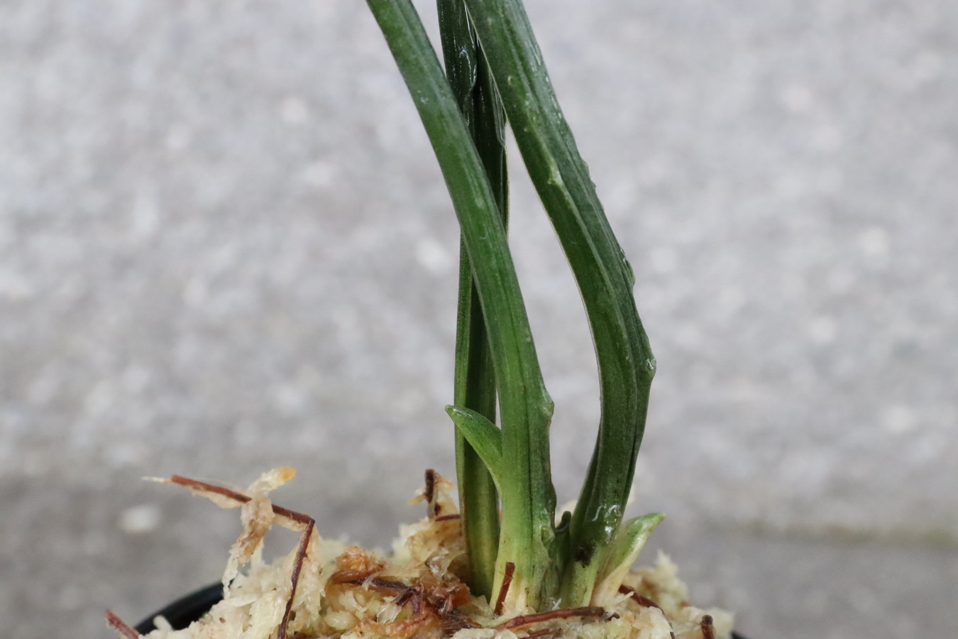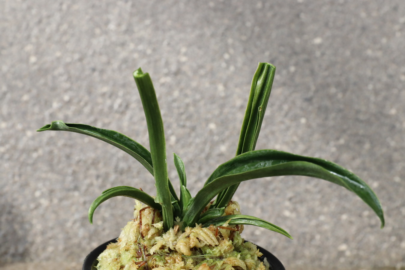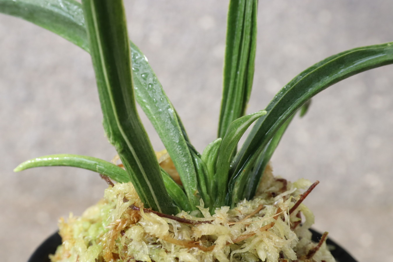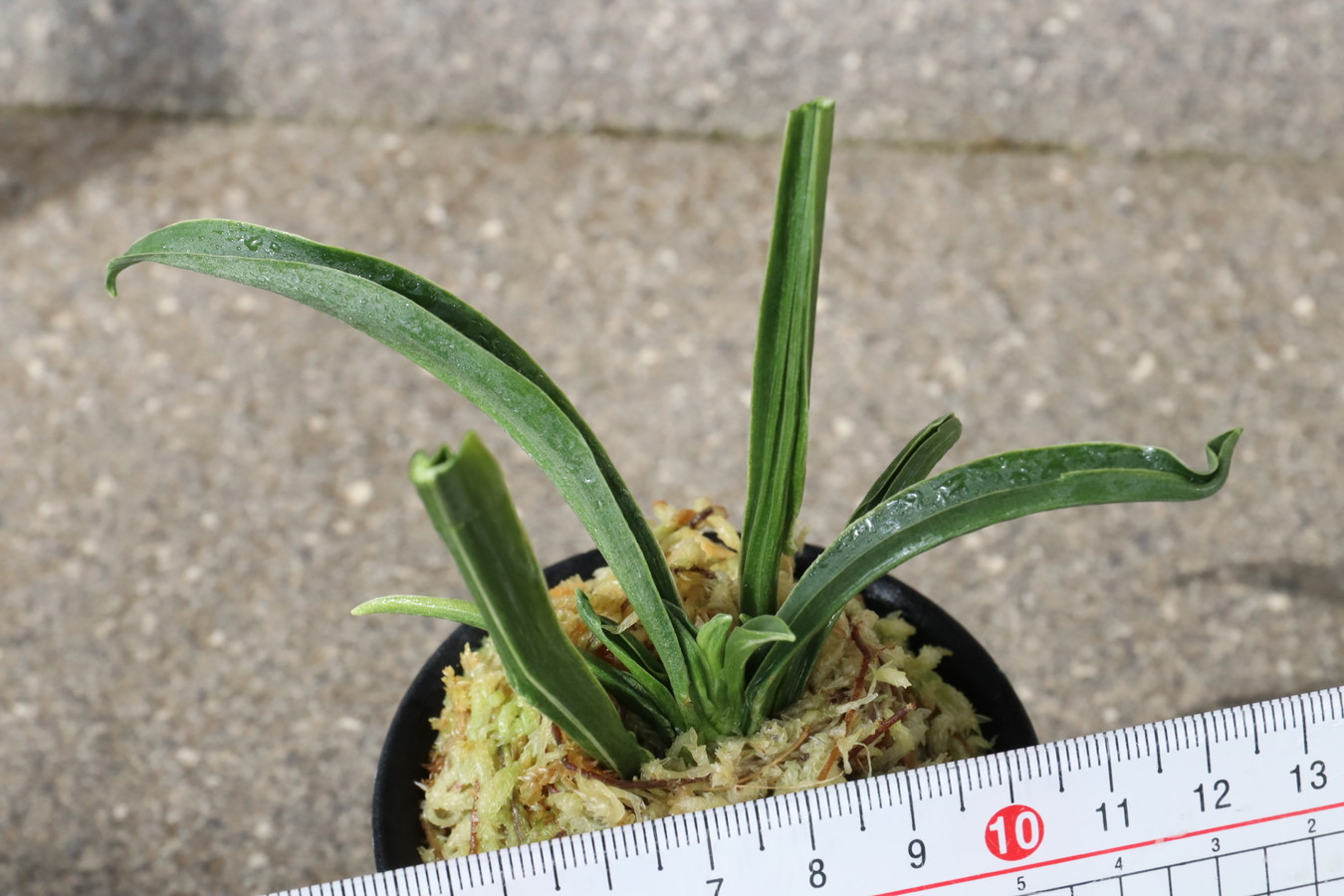 濃緑色で立ち葉性、独特の葉姿を見せる。